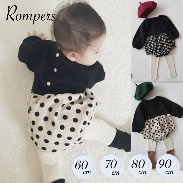 商品情報 サイズ 【size】60(66)cm / 70(73)cm / 80cm / 90cm【寸法】 ◇60(66)cm 着丈:40cm 袖丈:29cm 身幅:31cm ◇70(73)cm 着丈:43cm 袖丈:30cm 身幅:33cm ◇80cm 着丈:46cm 袖丈:31cm身幅:35cm ◇90cm 着丈:49cm 袖丈:32cm身幅:37cm素材 綿90% ポリエステル10%色について 【柄】ドット / チェック ※モニター発色の具合により色合いが異なる場合がございます商品について ◇後ろ姿もとても可愛くておしゃれなロンパース。普段着、お出かけ着としてもおすすめ! ◇背面のボタンや、股にスナップボタンが3つついていて、着替えやオムツ替えもしやすくなっております。◇かぼちゃパンツのようなデザインが赤ちゃんらしくてとても人気です。出産祝い、誕生日などの贈り物としても喜んでいただけます。注意事項 製造過程で多少糸のほつれや縫い目が粗い等生じる可能性がありますのでご了承ください。返品対象とはなりません。長袖 ドット チェック ロンパース カバーオール 子供 赤ちゃん ベビー服 女の子 出産祝い プレゼント 誕生日 女の子らしい可愛い柄 おしゃれママにオススメ!! ◇女の子らしいドット柄とチェック柄のロンパース。インナーを追加したり、レギンス・タイツなどを履けば長い期間着ることができます。◇シンプルなのでいろんなアイテムと相性がいいです。◇かぼちゃパンツのようなデザインが可愛い!◇出産祝いや誕生日などの贈り物としてもおすすめ!プレゼント対応可能◇ゆったりとしたサイズなので長く着られます。 柄は2つから選べます かぼちゃパンツのように見えるデザインが可愛い シンプルなブラック。汚れが目立ちにくい! カワイイベビー服が欲しい シンプルなデザインが好き! 出産祝いで子供服を探している チェック柄&ドット柄の可愛いロンパース。黒色の生地なので、食べこぼしで洋服が汚れやすいのが気になるママも安心してご使用いただけます。赤ちゃんでも甘くなりすぎないコーディネートにしたい方にもおすすめ! 1
