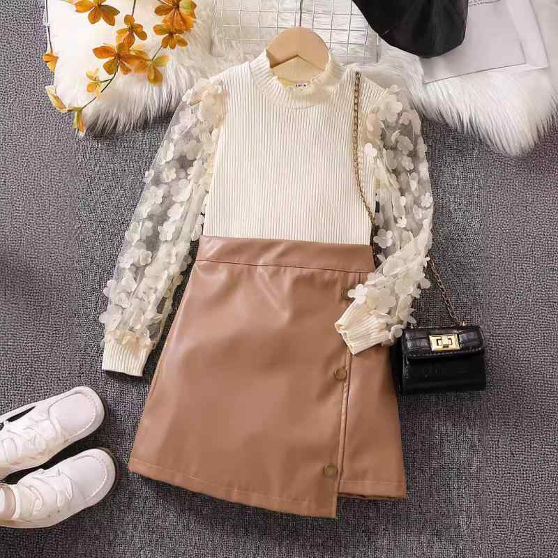 スカート 女の子 レザー メッシュ アップリケ スリーブ セット かわいい おしゃれ ガーリー 普段使い お出かけ着 インスタ映え