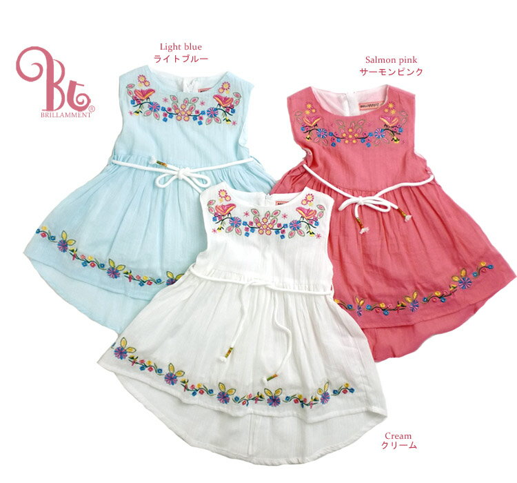 子供服 新作 BRILLAMMENT ワンピース ゴージャスなお花刺繍が施され 女の子 ノースリブワンピース(JPBt)子ども キッズ フィッシュテールデザイン かわいい クリーム ライトブルー サーモンピンク 6ヶ月 12ヶ月 1歳 2歳 3歳 ブリラメント