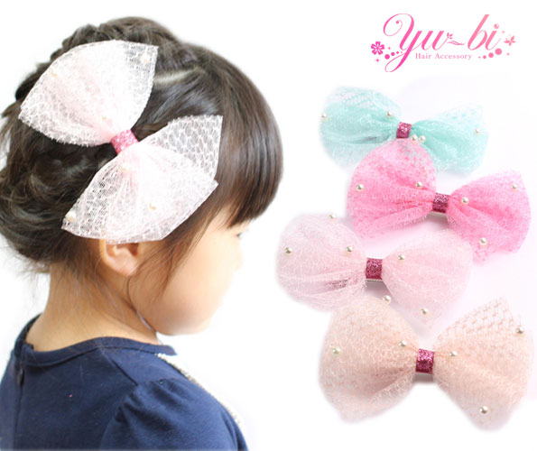 【1870円以上ゆうパケット送料無料】キッズヘアクリップ/パールちりばめ レースリボン ki87 ピンク/ベビーピンク/サーモンピンク/ミントグリーン ヘアアクセ 髪飾り キッズ 七五三 入学式 卒園式 入園式 女の子【あす楽対応】【リボン】【パール】