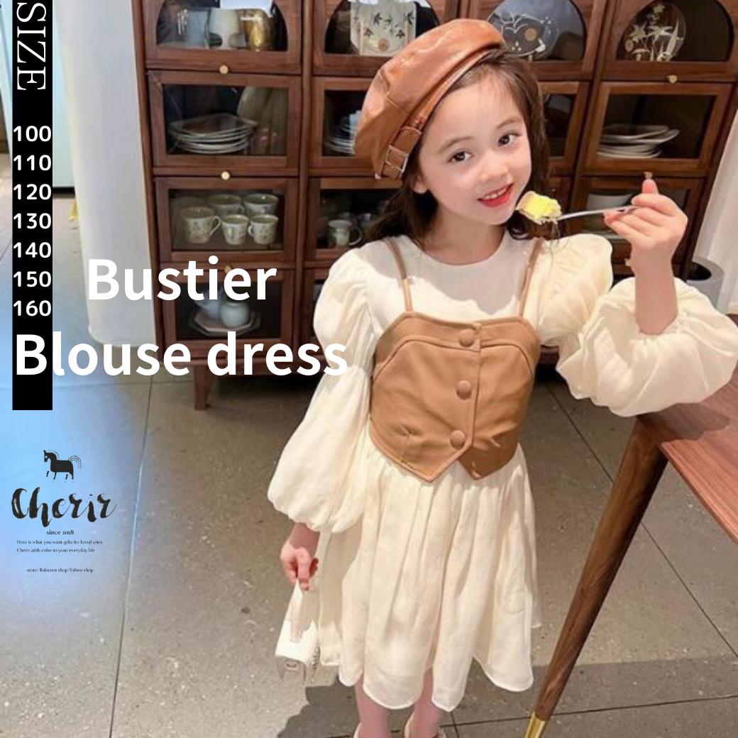 ビスチェワンピース 2点セット ブラウスワンピース ビスチェ キャミ付き ブラウス 春 夏 秋 女の子 100 110 120 130 140 150 160 2重 韓国ファッション インスタ tiktok セット アイボリー ナチュラル ブラウン 送料無料 長袖 スカート