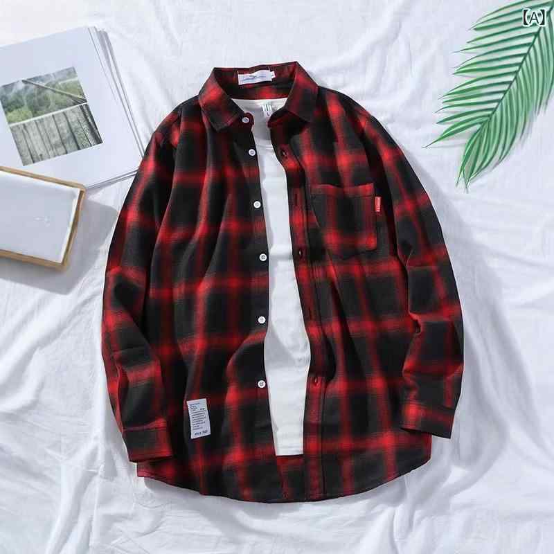 シャツ メンズ 男性用 長袖 格子柄 ドロップショルダー ゆったり リラックス カジュアル トップス ポリエステル 秋 赤 青 黒