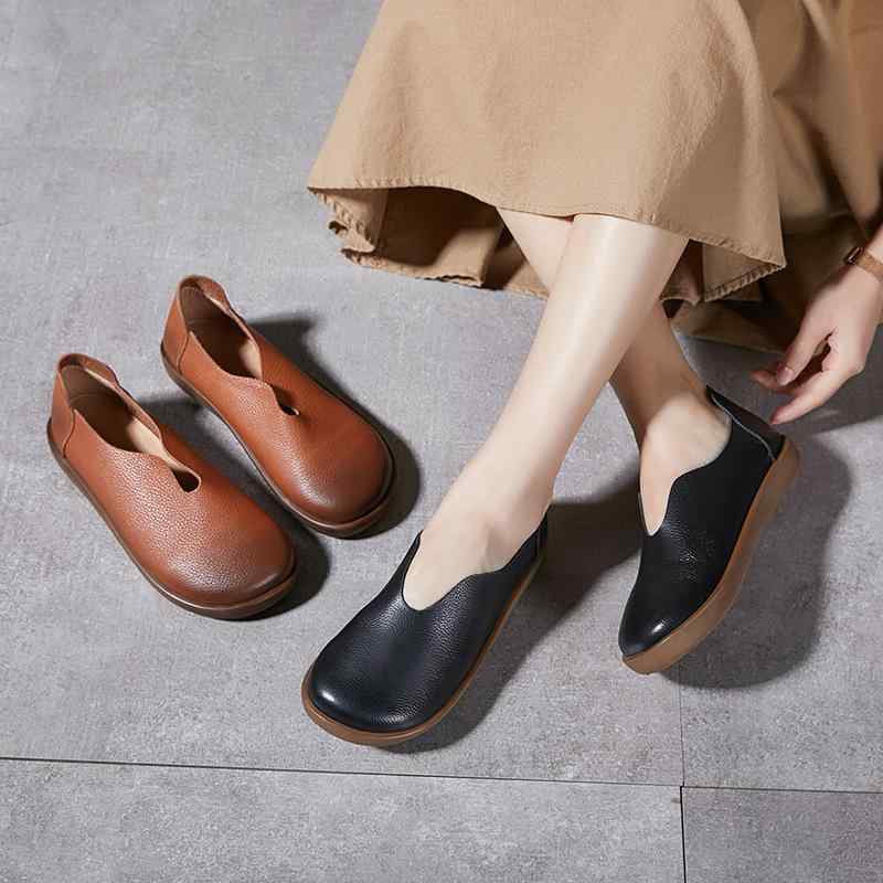 靴 レディース シューズ スリッポン フラット ローヒール ぺたんこ 痛くない 歩きやすい 柔らかい 本革 牛革 ラウンドトゥ 無地 春夏 秋冬 黒 ブラック 茶色 ブラウン 35 36 37 38 39 40 通勤 普段使い