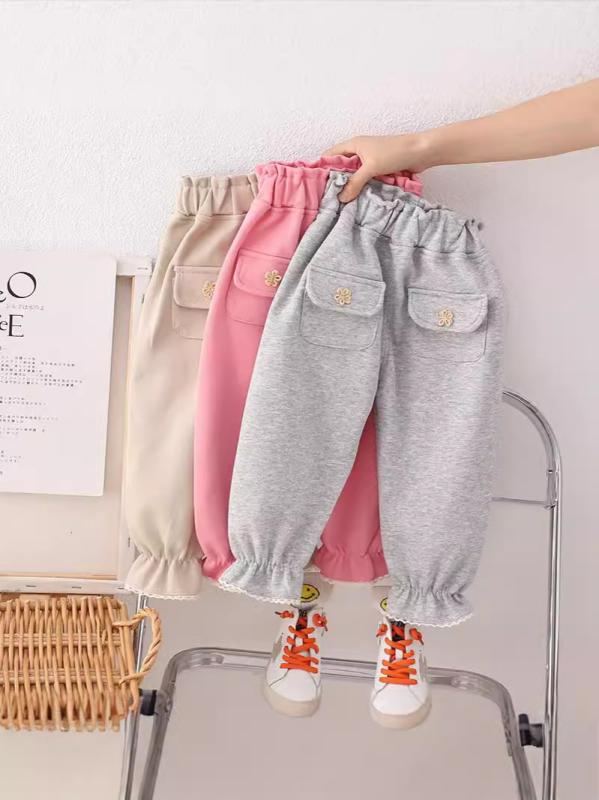 ベビー 女の子 パンツ 春秋 綿 スウェット カジュアル ロング 柔らかい肌触り ウエストゴム 無地 おしゃれ 普段使い お出かけ 股開閉 ミドルウエスト ポケット フリルデザイン ズボン ボトムス