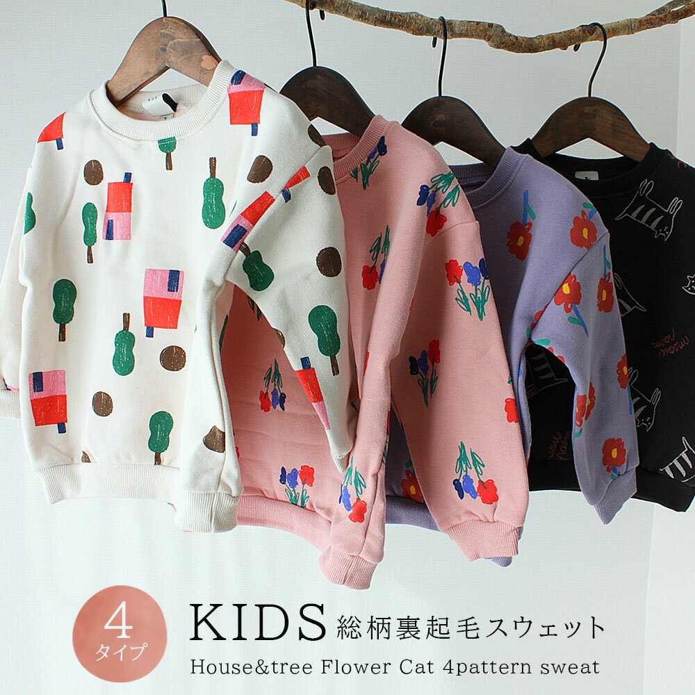 キッズ スウェット 裏起毛 総柄 子供服 センリ 子ども服 プチプラ ガールズ ボーイズ 男の子 女の子 トレーナー 韓国 冬 プリント 猫 キャット 花柄 アニマル フラワー あったか 暖かい あたたかい 可愛い かわいい トップス 長袖 送料無料 0015