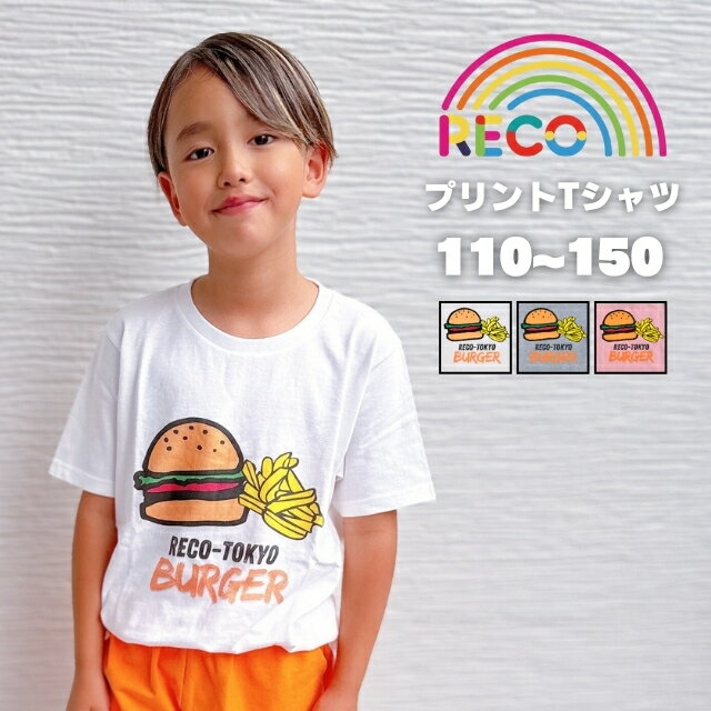 【プリントTシャツ】ハンバーガープリント フレンチフライ デザインプリント トップス tシャツ 半袖 子供服 キッズ こども ジュニア 男の子 女の子 アメカジ カラフルデザイン リンクコーデ お揃いコーデ ダンス ホワイト ピンク グレー reco-st27