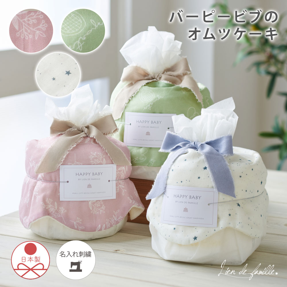 名入れ 出産祝い 女の子 男の子 おむつケーキ 3way 大判 スタイ オムツケーキ ガーゼ タオル 名前入り お食事ビブ ナチュラル くすみカラー くすみピンク ブルー グリーン ベビーギフト 3000円 おしゃれ かわいい 可愛い 花柄 星柄 新生児 Lien de famille
