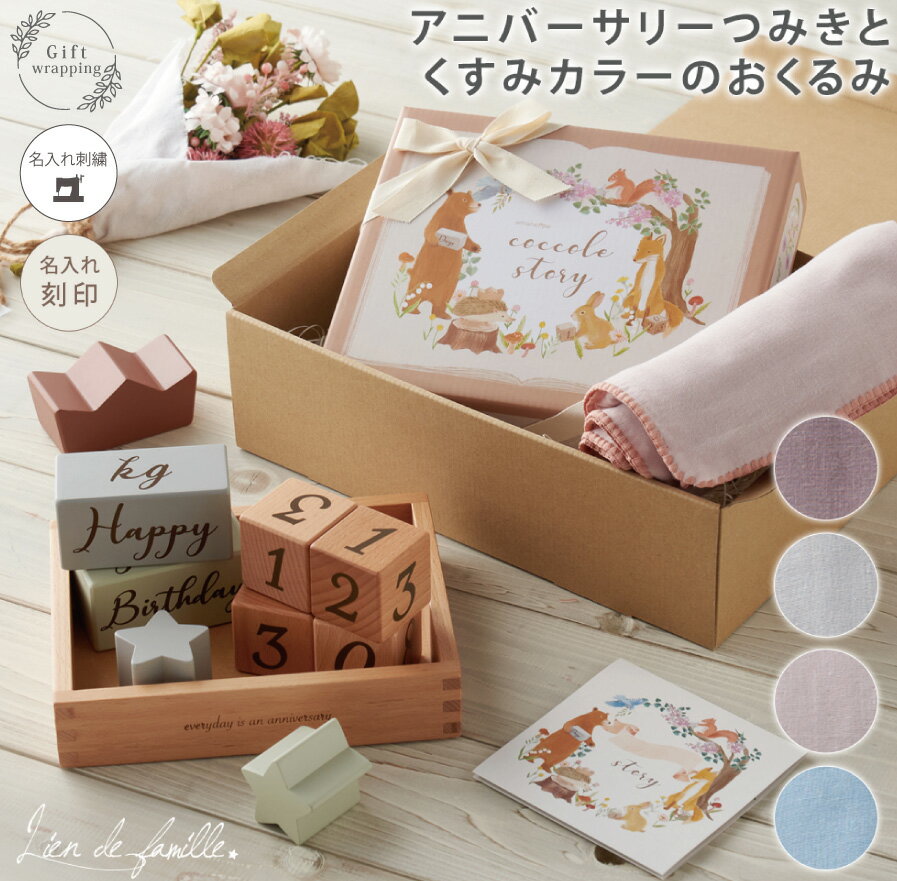出産祝い 女の子 男の子 月齢フォト 木製 つみき おくるみ ギフトセット 名入れ ベビー ウッドトイ 新生児 1歳 誕生日 シンプル かわいい ママもつかえる ブランケット 全4色 マタニティフォト Lien de famille リヤンドファミーユ