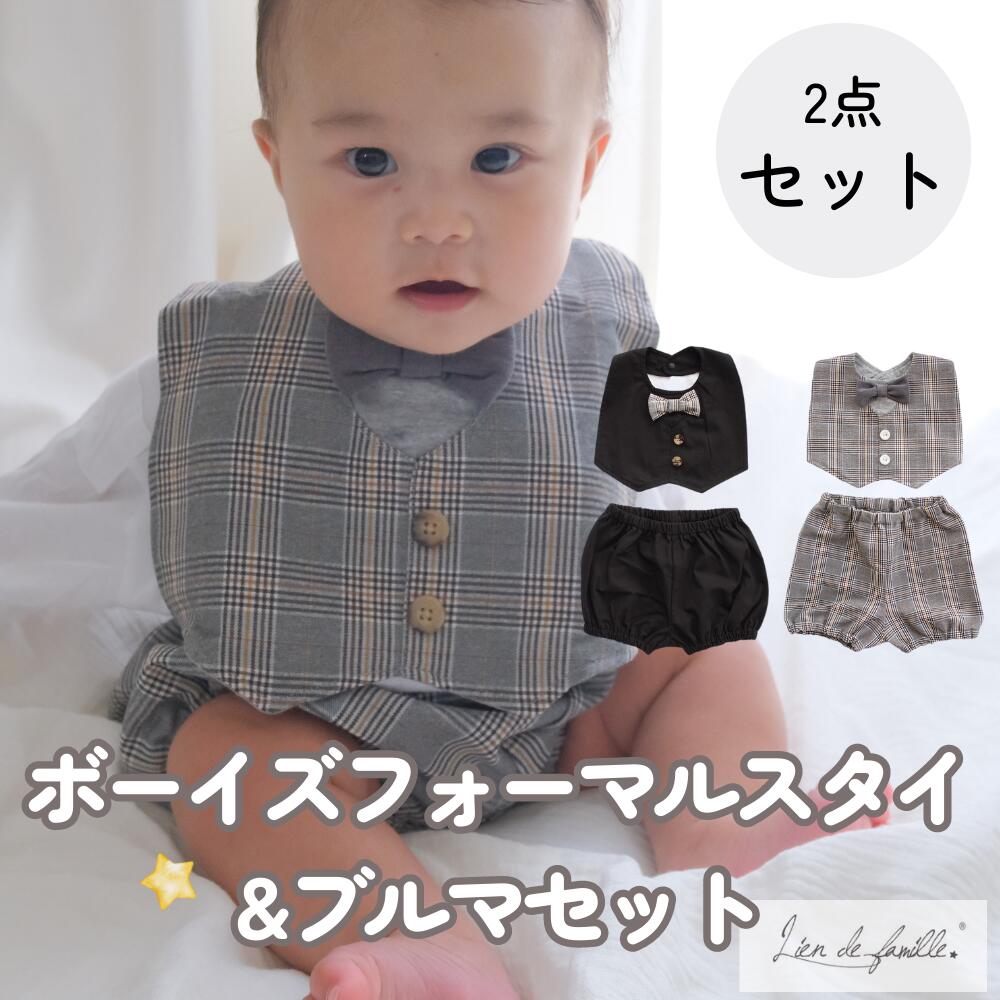 【半額】 【在庫処分】2点セット ボーイズフォーマルスタイ&ブルマセット Lien de famille リヤンドファミーユ 《ギフトBOX付き》ゆったり かぼちゃパンツ ぽわんパンツ 2点セット ダブルガーゼ 0歳 1歳 肌にやさしい 新生児 プレゼント こども服 子供服 ブラック 幼児