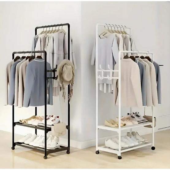 2段・3段・5本の黒い鉄の収納ラック - 帽子・コート・シャツ・靴などに最適 -棚とハングのあるフリースタンディングの収納ラック、エントランス・リビングルーム