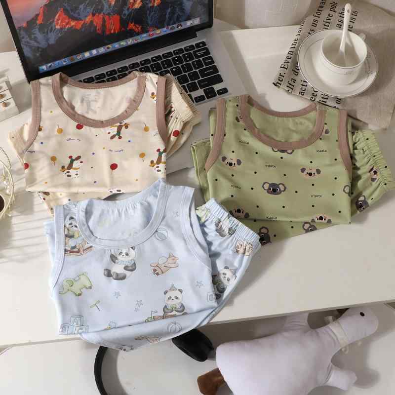 子供服 上下セット 男の子 夏 ノースリーブ ショートパンツ 天竺 再生繊維 薄手 パジャマ ホームウェア 部屋着 接触冷感 吸湿速乾 アニマル柄 カートゥーン