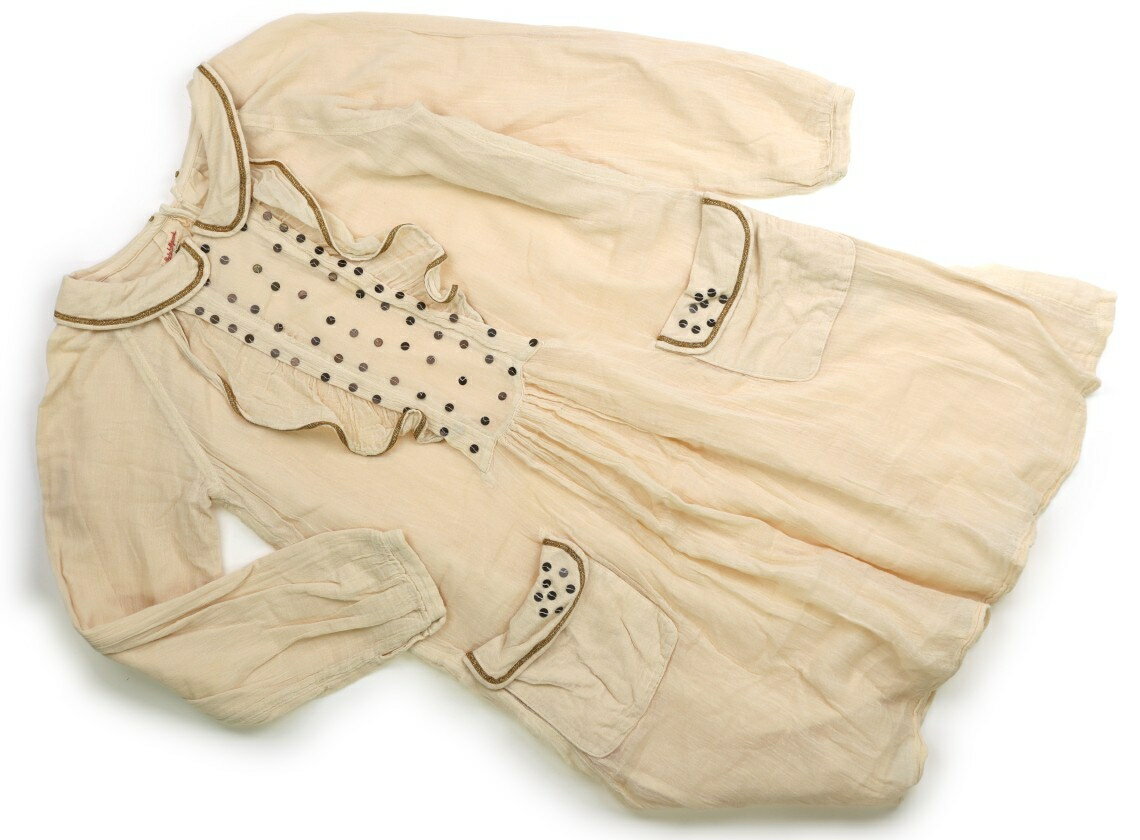 ブランド Go To Hollywood(ゴートゥーハリウッド) カテゴリー ワンピース サイズ 150サイズ 色 ベージュ・ゴールド 状態 ★★★ 記名 なし ジャンル Girl ガーゼ地。前身頃にはスパンコール装飾。裏地がありの二枚仕立てです。右肘には5cm程の黄色いシミが薄っすらとあります。ぱっと見は目立ちません。毛羽立ちがありますが、まだお使いいただけます。 *【状態】【サイズ】に関しての詳しい説明はこちら