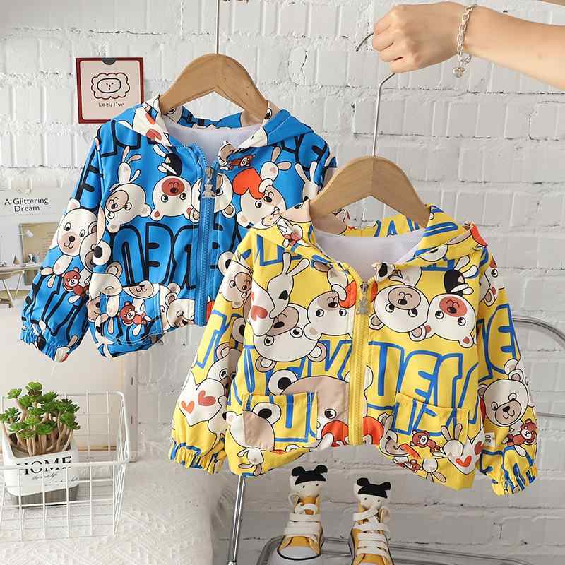 ジャケット 男の子 キッズ 春秋 アウター フード付き ブルゾン カジュアル 普段使い 韓国風 おしゃれ かっこいい スポーツ 綿 コットン 長袖 ジップアップ ミドル丈 ソフトな肌触り キャラクター柄 英字 ハート クマ イエロー ブルー