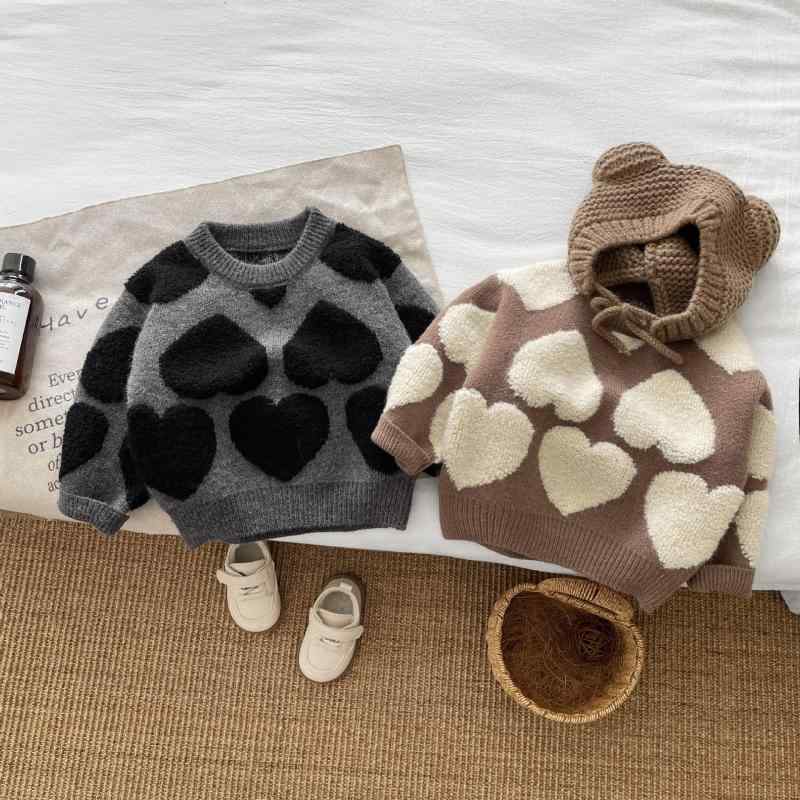 ニットセーター ベビー 男の子 女の子 冬 長袖 丸首 プルオーバー ハート柄 暖か 柔らかい アクリル混 カジュアル 普段使い 韓国 おしゃれ グレー カーキ かわいい トップス