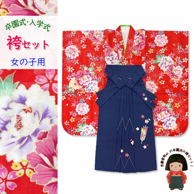 卒園式 女の子 袴セット 総柄 子供着物&刺繍袴セット(合繊)「赤 蝶と牡丹」BT1313ysk
