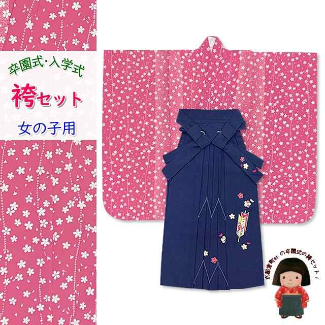 卒園式 入学式 七五三に 子ども袴セット 女の子用 小紋柄の子供着物(合繊)と刺繍袴 「濃ピンク、桜」K7Y414ysk7 購入 販売