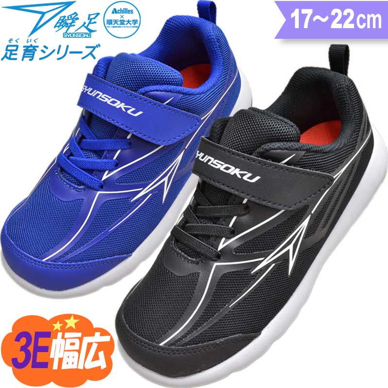 瞬足 そくいく キッズ スニーカー の詳細 商品種別 キッズ スニーカー キッズ シューズ 子供靴 (こどもくつ) 着脱タイプ ベルクロ マジックテープ 足周りサイズ EEE (3E) 重量 片足 128g (20cm) 取扱いカラー ブラック(黒) ブルー(青) 取扱いサイズ 17cm 17.5cm 18cm 18.5cm 19cm 19.5cm 20cm 20.5cm 21cm 21.5cm 22cm 材質 (アッパー) ポリエステル・合成皮革 / (ソール) EVA+ラバー 用途 通学靴 通園靴 運動会 遠足 修学旅行 スポーツ 対象 幼稚園 保育園 小学校 子供 男の子 女の子 男子 女子 男児 女児 学校 年長 年中 園児 小学生 ラッピング プレゼント(ギフト・贈り物)用のラッピングを承っております。入学・入園のお祝いやお誕生日プレゼントにも最適です。 靴のサイズの選び方 靴のサイズ 中敷きのサイズ 靴のサイズ 中敷きのサイズ 靴のサイズ 中敷きのサイズ 靴のサイズ 中敷きのサイズ 17 18 17.5 18.5 18 19 18.5 19.5 19 20 19.5 20.5 20 21 20.5 21.5 21 22 21.5 22 22 23 ※足のサイズには個人差がありますので、あくまで目安としてお考えください。瞬足そくいく=瞬足(アキレス)× 順天堂大学 3E ゆったり幅広モデル アキレスと順天堂大学の共同開発で生まれた「正しい歩行が自然と身につく靴」です! 足幅が広いお子様や足の甲が高いお子様向けに開発された、標準の足周り2Eサイズより足周りがゆったりしている3E幅広ワイドモデルです。 子供たちの正しい足の育成をサポートするヒールロックシステムとアナトミーインソール、アウトソールを採用し、正しい歩行が自然に身につくように設計されています。 かかとの硬めのパーツがかかとの骨が未発達な成長段階の子どもの足をしっかりささえます。 通気性にすぐれるメッシュを使用していますので、足の蒸れを抑えます。