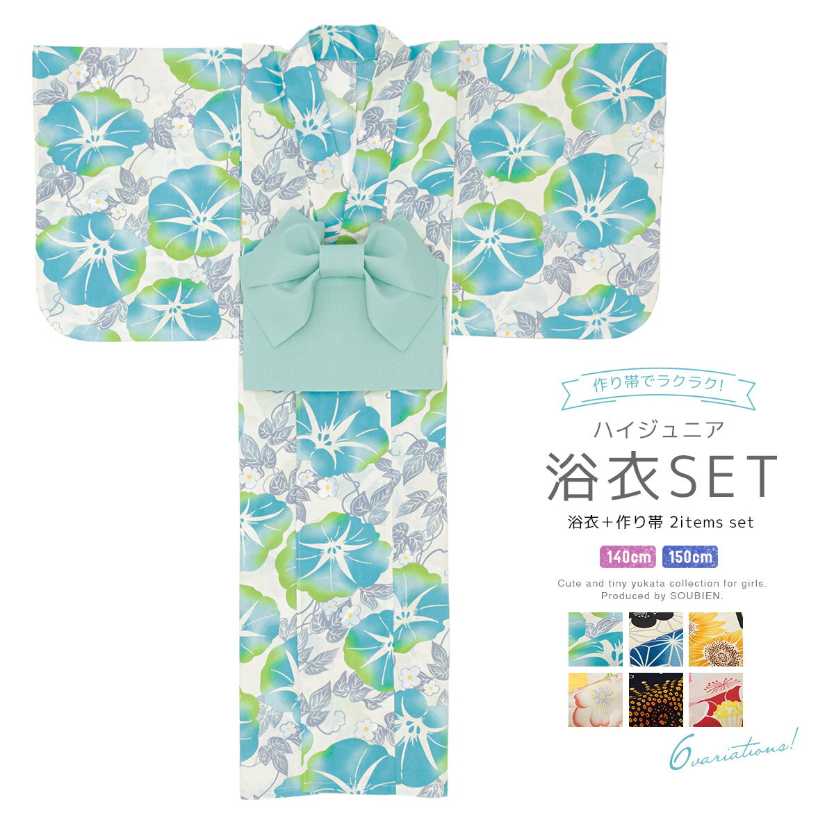 Black Friday☆最大1000円クーポン配布中☆浴衣 セット 作り帯 子供 女の子 2点セット 白系 水色 黒紺 ピンク 朝顔 麻の葉 向日葵 桜 花火 椿 花 綿 リボン 仕立て上がり 送料無料
