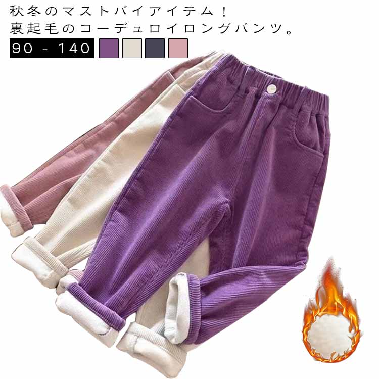 秋冬のマストバイアイテム!裏起毛のコーデュロイロングパンツ。ウエストはゴムがしっかり入っており、ゆったりシルエットで動きやすさ◎秋冬のお洋服にマッチする、4色展開でご用意しております。ユニセックスで着られるデザイン、男の子、女の子問わずおすすめです。裏起毛タイプなので、ズボン1枚でも非常に暖かいです。リラックスしたシルエットで履き心地抜群。シンプルで通園、通学や、おでかけにおすすめのアイテムです。 サイズ 90 100 110 120 130 140 サイズについての説明 90:ズボン丈51cm ヒップ66cm ウェスト42cm/ 100:ズボン丈55cm ヒップ70cm ウェスト44cm/ 110:ズボン丈61cm ヒップ74cm ウェスト46cm/ 120:ズボン丈66cm ヒップ78cm ウェスト48cm/ 130:ズボン丈71cm ヒップ82cm ウェスト50cm/ 140:ズボン丈76cm ヒップ86cm ウェスト52cm/ ※サイズ表の実寸法は商品によって1-3cm程度の誤差がある場合がございます。 素材 ポリエステル 色 パープル ホワイト ダークグレー ピンク 備考 ●サイズ詳細等の測り方はスタッフ間で統一、徹底はしておりますが、実寸は商品によって若干の誤差(1cm~3cm )がある場合がございますので、予めご了承ください。 ●製造ロットにより、細部形状の違いや、同色でも色味に多少の誤差が生じます。 ●パッケージは改良のため予告なく仕様を変更する場合があります。 ▼商品の色は、撮影時の光や、お客様のモニターの色具合などにより、実際の商品と異なる場合がございます。あらかじめ、ご了承ください。 ▼生地の特性上、やや匂いが強く感じられるものもございます。数日のご使用や陰干しなどで気になる匂いはほとんど感じられなくなります。 ▼同じ商品でも生産時期により形やサイズ、カラーに多少の誤差が生じる場合もございます。 ▼他店舗でも在庫を共有して販売をしている為、受注後欠品となる場合もございます。予め、ご了承お願い申し上げます。 ▼出荷前に全て検品を行っておりますが、万が一商品に不具合があった場合は、お問い合わせフォームまたはメールよりご連絡頂けます様お願い申し上げます。速やかに対応致しますのでご安心ください。