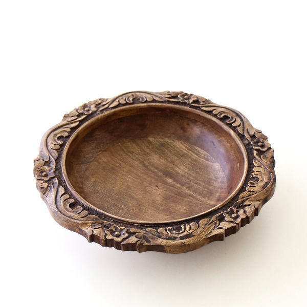 木製トレイ 直径30cm ウッドトレイ 小物入れ 彫刻 木製 ボウル トレー 丸 円形 天然木 マンゴーウッド 無垢 ウッドボウル アジアン ナチュラル インテリア キッチン リビング 卓上 収納 お皿 ディッシュ プレート お椀 ウッドカービングボウル S