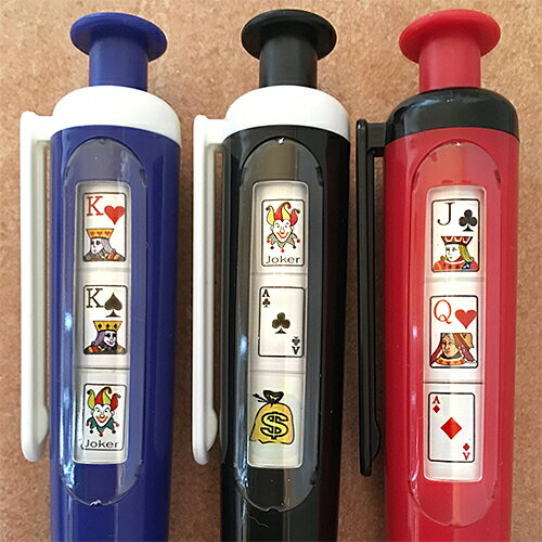 一瞬の癒し!暇つぶし!運試し! しかも書けます! 黒・青・赤の3本セット ※インクは全て黒色です。 トランプ、ダイス、スロット、スカルの中からお好きな柄をお選びください。 【替え芯について】 アメリカ企画商品のためそのまま交換して使える替え芯はありませんが、裏技でuni(三菱鉛筆)の"S-7S"をセットされている芯と同じ長さに切ると対応できます。 他のメーカーでも大体の突起位置があっていれば長さを揃えることで使用できそうですが未確認です。 ご自宅に眠っている芯があればお試しください。