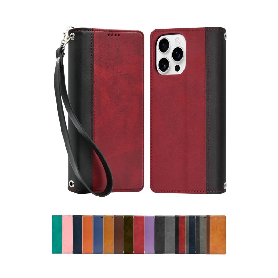 シズカウィル iPhone 16 Pro Max 用 ケース カバー 手帳型 本革調 レザーケース ボルドーレッド×ブラック 1個入り