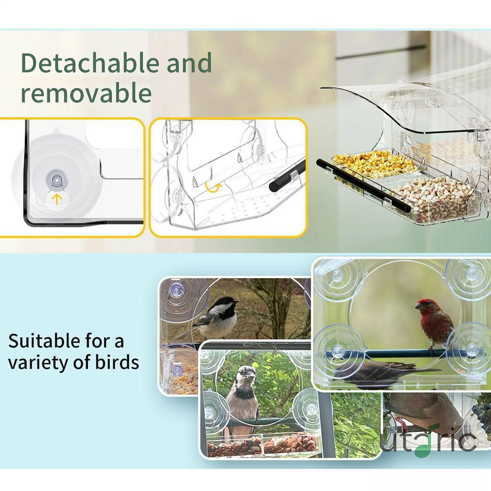 吸引カップバードフィーダーウィンドウ - クリアウィンドウバードフィーダー|取り外し可能なフードトレイ付きの透明なアクリルフードボックス|パティオ、裏庭、アパート、デッキ、バルコニーの使用のためのリークプルーフ屋内ビュー