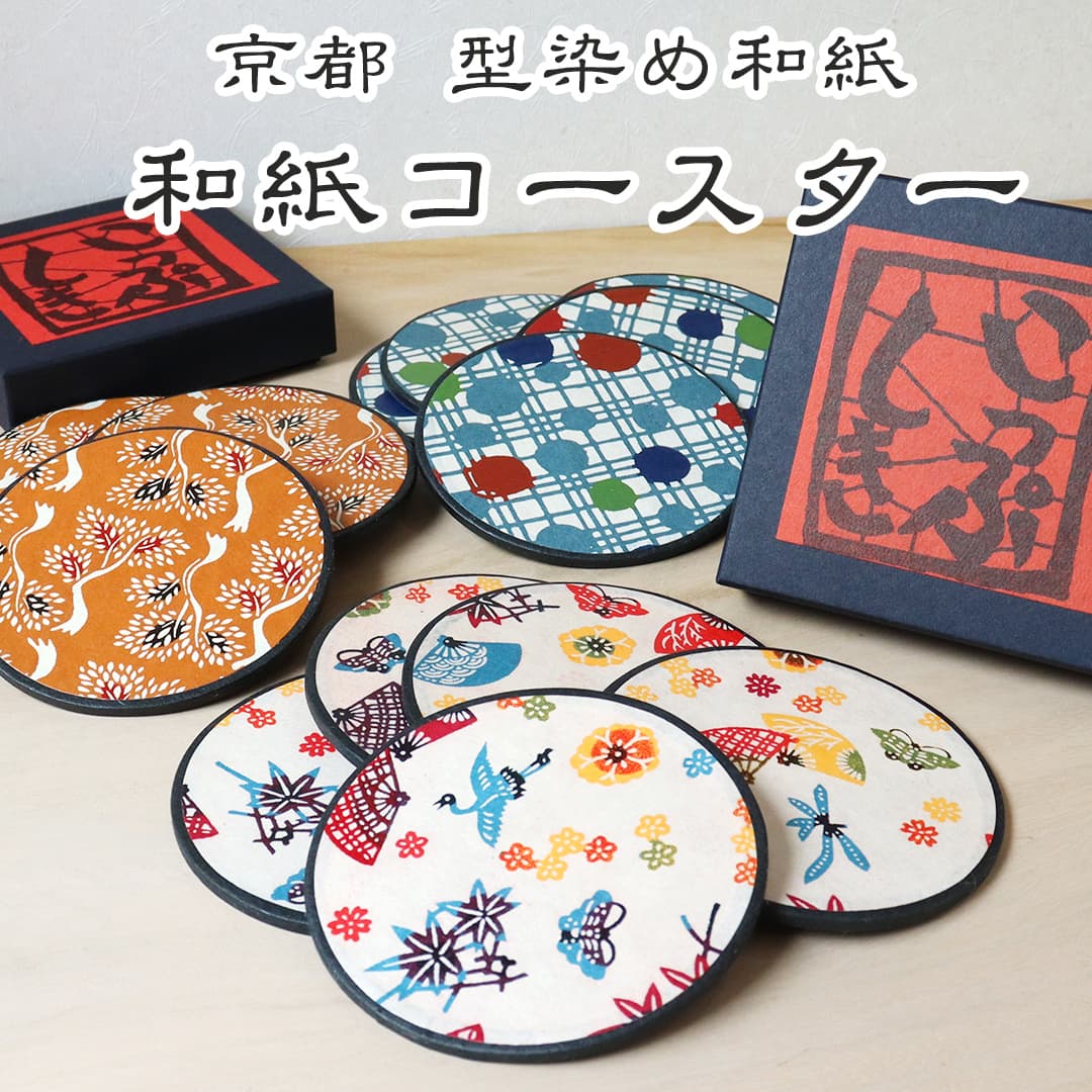 京都 型染め和紙 丸コースター 箱付き ギフトにワイングラスにビールグラス お洒落に演出色彩鮮やか 5枚セットコップ敷き 丸型 プレゼントにパーティーにも伝統工芸 入学祝い 就職祝い 敬老の日 プレゼント ギフト送料無料 ママ割 おすすめ