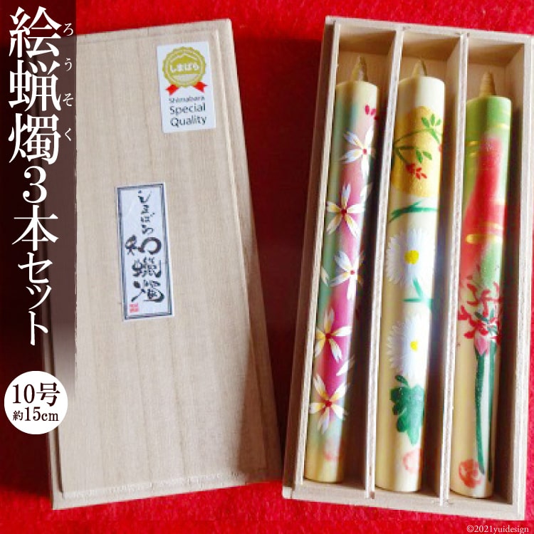 島原の櫨を主原料とし、手掛け手法を用いた手作りのもので、島原の絵付師が1本1本手書きで絵付けしたものです。 特徴としましては、油煙が非常に少なく炎にゆらめきがあります。使用にあたりましては、風のある所や強い光や熱のある所での使用は控えてください。 また、燃焼中、残り芯が長くなりましたら、芯つまみで長い部分のみ取り去ってください。 長期保存しますと、蝋燭に白い粉がふくことがありますが、品質に変わりはありません。柔らかい紙や布でふき取ってください。 返礼品詳細原材料櫨の実、アクリル絵の具 内容量 ・絵付き和蝋燭10号(約15cm)×3本 ※燃焼時間 約130分 ※絵柄指定はできませんので予めご了承ください。 製造元本多木蝋工業所 〒859-1413 長崎県島原市有明町大三東丙545 ・ふるさと納税よくある質問はこちら ・寄附申込みのキャンセル、返礼品の変更・返品はできません。あらかじめご了承ください。