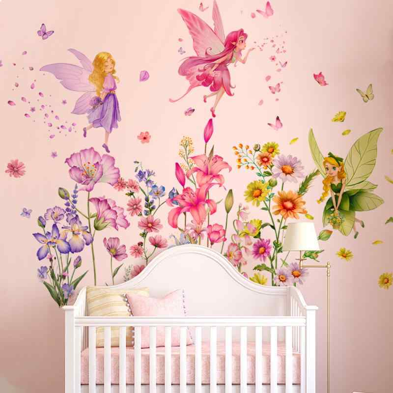 ウォールステッカー 女の子 ガールズ 子供部屋 貼ってはがせる 自己粘着式 簡単貼付 花の妖精 フラワーフェアリー 植物 花 蝶 バタフライ ボタニカルデザイン リビング 寝室 背景装飾 デコレーションシール