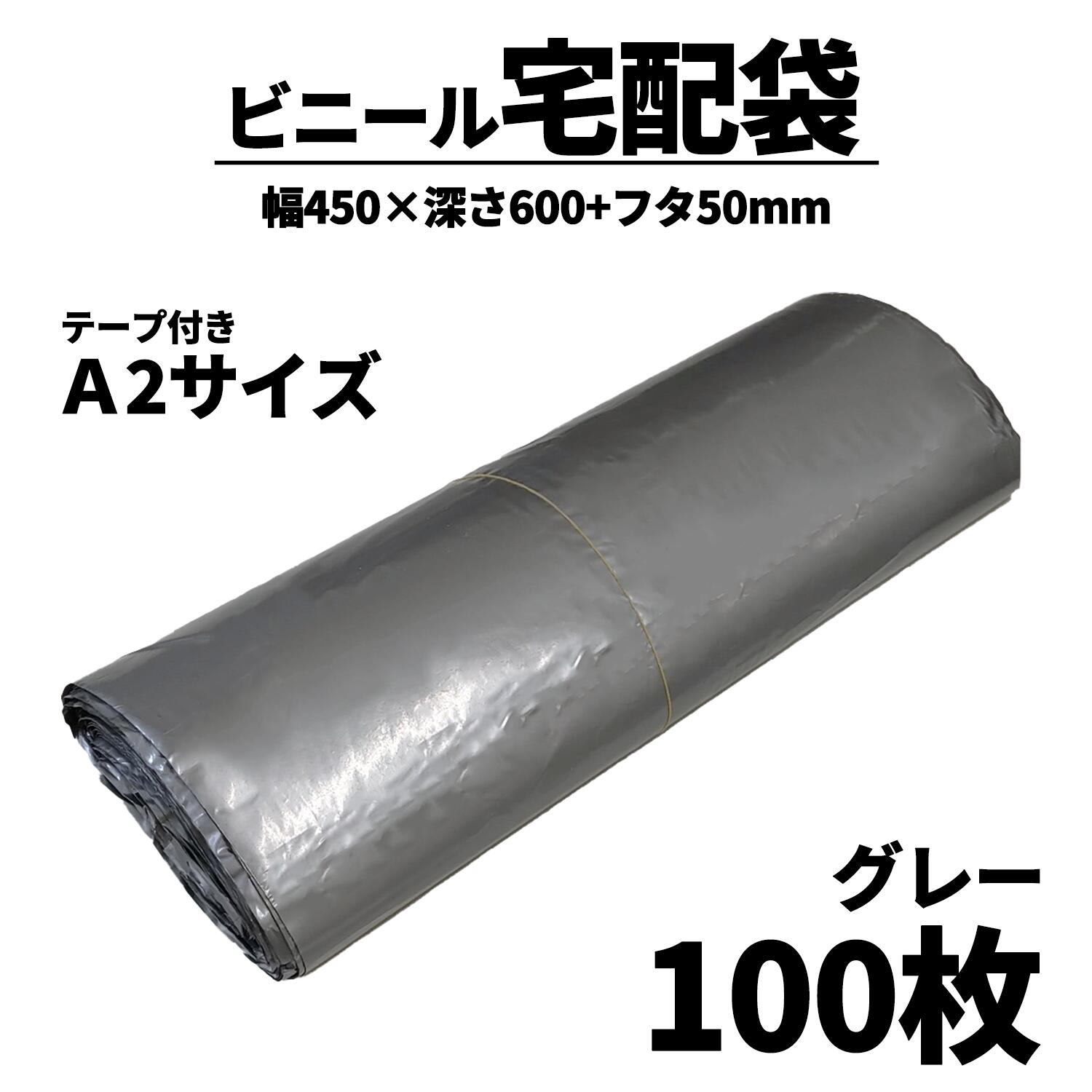【スーパーセール限定価格】ビニール袋 厚手 テープ 宅配袋 幅450 深さ600 フタ50mm 100枚 A2 グレー 宅配袋 粘着 大きい 特大 灰色 宅配ポリ袋 梱包資材