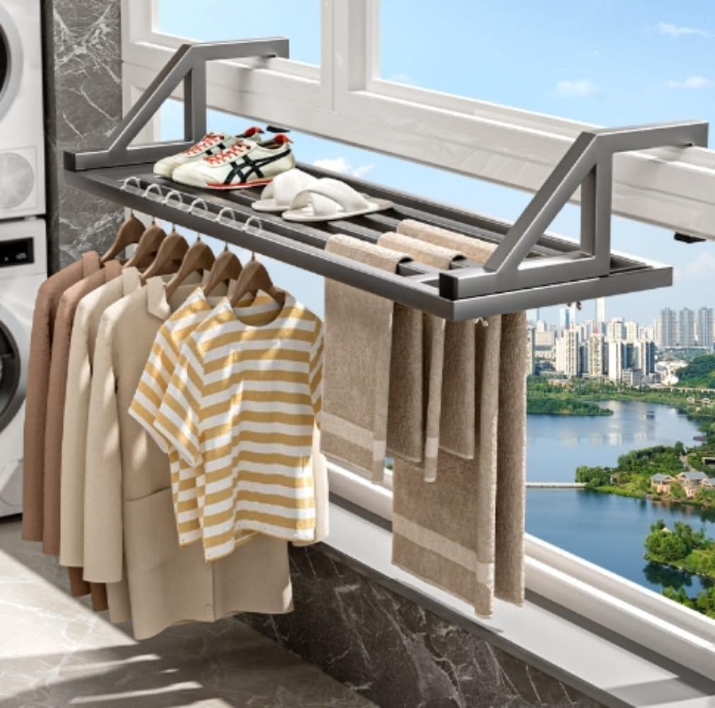 物干し竿、窓枠、バルコニー手すり、フック式物干し竿、布団干しタオル掛け、屋外物干し竿、省スペース物干し竿、物干し竿、物干し竿、炭素鋼製物干し竿、サビ靴を乾燥させるための防水性と防風性 (グレー,40cm)