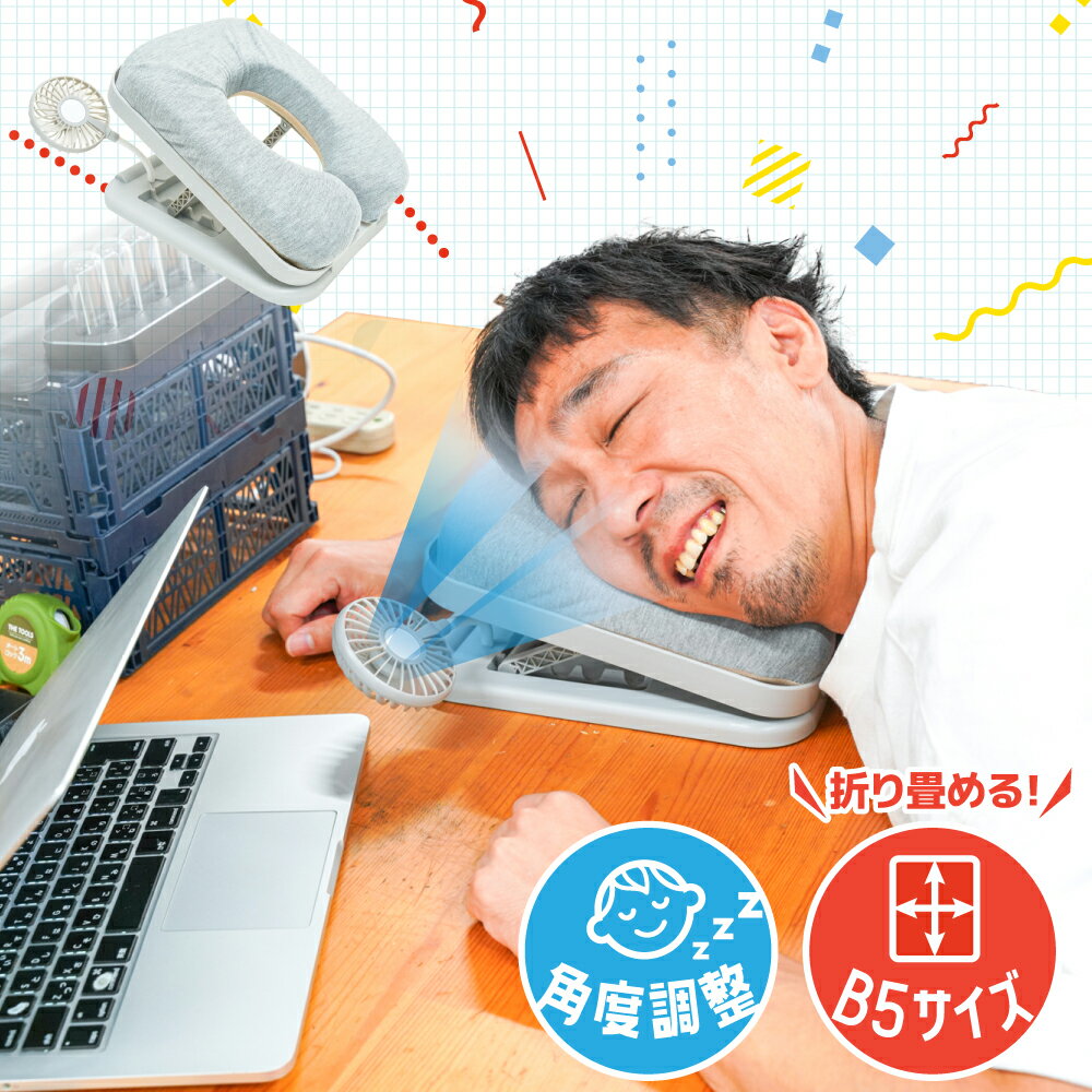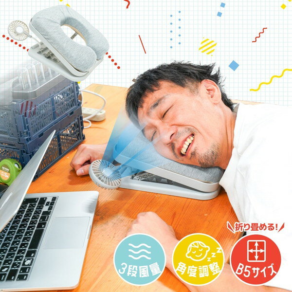 商品説明★ デスクで快適に仮眠、お昼寝したいあなたへ仕事がひと段落して、ちょっとデスクで仮眠。でもデスクが低くて首が痛い…蒸れるし腕まくらで腕がシビれる…一度でもそんな体験をしたことがあるあなたへ、ぴったりなものをおすすめ!お昼寝まくらにファンがついた!?角度調整できるまくらに、ファンが一体化でとっても快適!うつぶせも横向きも、これからは心地よくお昼寝することができます。★ 風量調整&角度調整4段階の角度調整に3段階の風量調整で自分だけの快適お昼寝まくらにできます。おでこを涼むも良し、顔を涼むも良し。ファンのアームはぐにゃぐにゃと自由自在に曲げられるから、好きな角度でご利用いただけます。★ イヤホンをつけたままでもOKまくらの中央は穴が空いているので、うつぶせ寝にも最適!もちろん、横向き寝にもおすすめです。このまくらの穴があることによって、耳が圧迫されないのでイヤホンをつけたままでもOK!※注意事項・記載されている物以外は付属いたしません。・分解しないでください。・メーカーは本製品をご利用において生じる事故や荷物破損、ケガなど一切の責任は負わないものとします。・異常を感じたらご使用をやめてメーカーカスタマーサポートまでご連絡ください。・本製品をご利用において生じる物品の破損は、メーカー保証の対象外となります。・ご使用中においてのお客様の過失による故障、破損、改造等はメーカーサポート保証の対象外となります。・正しく使用されない場合に生じた事故等についてメーカーでの責任は負いかねます。・製品仕様は改善のため予告なく変更する場合があり、そのため説明書記載の内容と異なる場合があります。スペック* サイズ: 幅185×高さ260×奥行75(mm)* 重量: 約406g* 電源: USBにて充電 5V1A* バッテリー: リチウムイオン 3.8V 1200mAh* 充電時間: 約4時間* 連続稼働時間: [弱]約7時間/[中]約4時間/[強]約3時間* 角度調整: 4段階* 風量調整: 3段階(弱/中/強)* 素材: PP、PS、ポリウレタン、ポリエステル* 内容品: 本体、USBケーブル(約300mm)、日本語取扱説明書