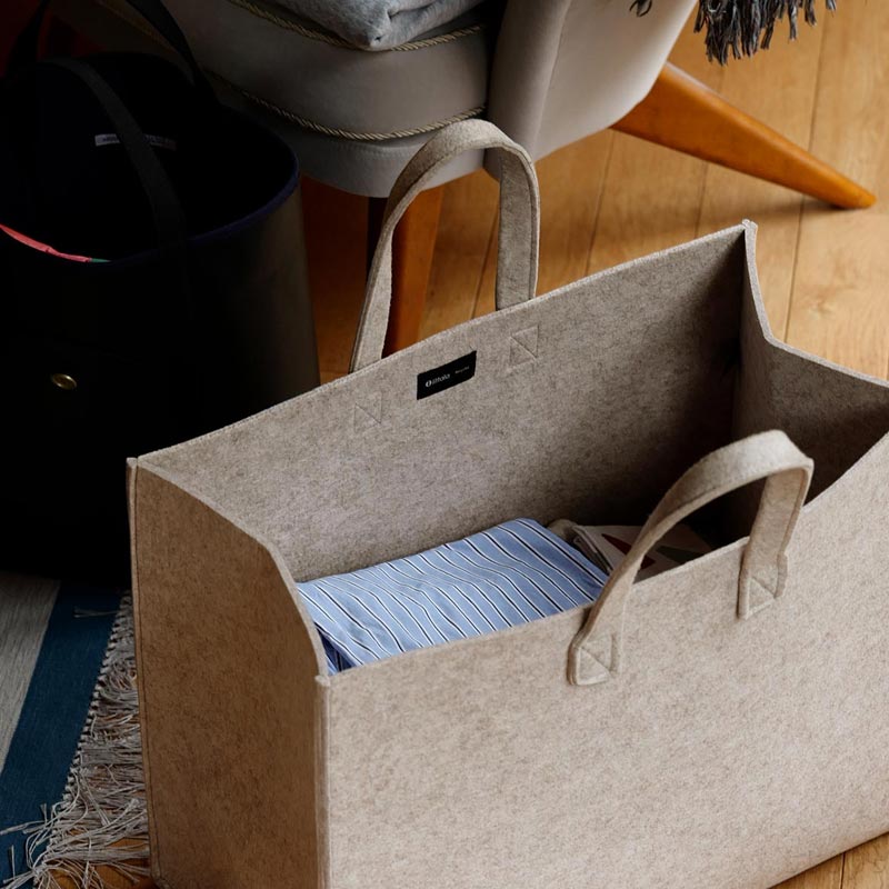 スペック 材質 ポリエステル(100%リサイクル素材) 寸法 M : W300×D200×H355(475)mm L : W500×D250×H405(565)mm ※ ()内は持ち手を含んだ高さ フェルト厚:5mm 生産 Made in China 備考 洗濯:× / 漂白:× / タンブル乾燥:× / アイロン:× / ドライクリーニング:×