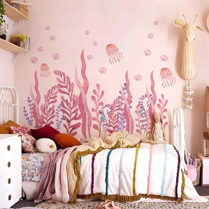 ウォールステッカー キッズ 子供部屋 寝室 リビング ピンク 海底 水草 クラゲ 貼るだけ 簡単 粘着式 PVC製 背景装飾 美化 モダン シンプル 壁紙シール(x2)