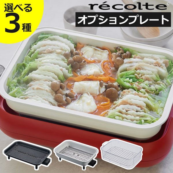 商品詳細 【ホットプレート専用 グリルプレート】 ■サイズ プレート:約幅34cm×奥行き21.5cm×高さ6.5cm 油受け皿:約幅20.5cm×奥行き7.5cm×高さ2.5cm ■素材 プレート:アルミダイキャスト(フッ素樹脂コーティング) 油受け皿:スチール(フッ素樹脂コーティング) ■重量 プレート:約950g 油受け皿:約80g 【ホットプレート専用 セラミックスチーム深鍋】 ■サイズ 深鍋:約幅34.5cm×奥行き22.5cm×高さ10.5cm 蒸しプレート:約幅29.5cm×奥行き19.5cm×高さ0.7cm ■素材 深鍋:アルミダイキャスト(セラミックコーティング) 蒸しプレート:ステンレス ■重量 深鍋:約950g 蒸しプレート:約200g 【ホットプレート専用 クリアスチーマー】 ■サイズ スチーマー:約幅39cm×奥行き23cm×高さ10.5cm 蒸し網:約幅31.5cm×奥行き21.5cm×高さ0.2cm ■素材 スチーマー:トライタン 蒸し網:ステンレス ■重量 深鍋:約950g スチーマー:約310g 蒸し網:約100g スタッフコメント レコルト ホットプレートと組み合わせて使えるオプションアイテムです。既にホットプレートをお持ちの方や、購入を検討されている方にぴったり。1枚プラスするだけでも、レシピの幅がぐっと広がるので新しいお料理も楽しんでいただけます。ヘルシーに焼き上げるグリルプレートや、煮込み料理に便利な深鍋、蒸し料理をたっぷり楽しめるスチーマーなど、ホットプレートを使うのがますます楽しみになるアイテムを取り揃えました。【 recolte ホットプレート オプション レコルト 】 OPTION INTRODUCTION オプション紹介 ※レコルト ホットプレート専用オプションです。 ホットプレートを使った料理がもっと楽しめる3アイテム recolte ホットプレート オプション レコルト ホットプレートと組み合わせて使えるオプションアイテムです。 既にホットプレートをお持ちの方や、購入を検討されている方にぴったり。 1枚プラスするだけでも、レシピの幅がぐっと広がるので新しいお料理も楽しんでいただけます。 ヘルシーに焼き上げるグリルプレートや、煮込み料理に便利な深鍋 蒸し料理をたっぷり楽しめるスチーマーなど、ホットプレートを使うのが ますます楽しみになるアイテムを取り揃えました。