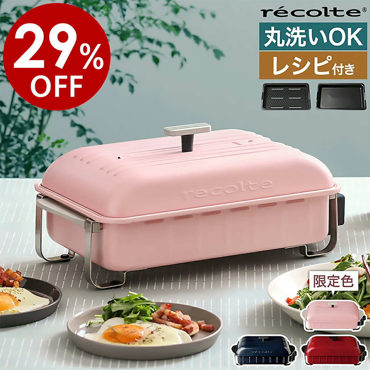 ▼ インテリアショップ roomy ( ルーミー )からのコメント ■ r?colte Hot Plate / レコルト ホットプレート RHP-1 パワフルなヒーターとプレートが一体になったrecolte(レコルト) ホットプレート。フッ素樹脂コーティングのプレートの裏面にヒータ—が内蔵された構造で、熱がダイレクトに伝わり、素早く立ち上がります。プレート全面が均一に熱くなるのでムラなく焼けるのも◎。本体・プレート・フタが丸洗いできて、お手入れも簡単。ベーシックなフラットプレートとタコヤキプレート、レシピブックが付属しています。 レコルト(récolte)について 毎日の暮らしに「ちょうどいい」家電を届ける日本発のブランドです。コンパクトでスタイリッシュなデザインにこだわり、キッチンやインテリアに自然と馴染む製品が特徴です。使いやすさと機能性のバランスを重視し、一人暮らしからファミリー層まで、幅広いライフスタイルにフィットするアイテムを展開しています。 「必要なものを、必要な分だけ」。このミニマルな考え方を大切にしながら、忙しい現代人の毎日を少しだけ豊かにするお手伝いをしています。トースターやブレンダー、ホットプレートなど、日々の調理が楽しくなる工夫が詰まったレコルトの製品は、贈り物としても人気があります。 レコルト(récolte) キッチン家電シリーズ 朝食のトーストを香ばしく焼き上げるトースター、手軽にスムージーが作れるミキサー、さらにはおしゃれな電気鍋まで、レコルトのアイテムはどれもコンパクトで使いやすい設計。シンプルで洗練されたデザインだから、キッチンに置くだけでインテリアの一部としても楽しめます。 また、レコルトなら時短・簡単調理も叶うので、忙しい朝や疲れた夜でも、美味しく栄養バランスの取れた食事があっという間に完成!話題のおしゃれなキッチン家電としても人気で、「料理をもっと楽しみたい」「キッチンをおしゃれにしたい」と思う方にはぴったりです。 ●キッチン家電をチェック >> ●レコルトブランドをチェック >>récolte Hot Plate / レコルト ホットプレート RHP-1 特典キャンペーン実施中 強火力プレートでアツアツのごちそうを パワフルなヒーターとプレートが一体になった『 recolte Hot Plate( レコルト ホットプレート )』。フッ素樹脂コーティングのプレートの裏面にヒータ—が内蔵された構造で、熱がダイレクトに伝わり、素早く立ち上がります。プレート全面が均一に熱くなるのでムラなく焼けるのも◎。本体・プレート・フタが丸洗いできて、お手入れも簡単。ベーシックなフラットプレートとタコヤキプレート、レシピブックが付属しています。 家電 部門 2024年2月25日(日)更新 (集計日:2月24日) サイズ 約 幅 445mm×奥行き 250mm×高さ 155mm( フタ、フラットプレート、コントローラーセット時 ) [ フラットプレート ] 約 幅 340mm×奥行き 213mm×高さ 66mm 内寸:約 幅 283mm×奥行き 177mm×高さ 29mm [ タコヤキプレート ] 約 幅 318mm×奥行き 213mm×高さ 64mm 内寸:約 幅 300mm×奥行き 195mm 穴1つあたり:直径 約 45mm×深さ 24mm ディップポケット:約 幅 53mm×奥行き 59mm×深さ 20mm ※本体外寸以外、当店調べ 重さ 約 2.6kg( フタ、フラットプレート、コントローラーセット時 ) フラットプレート:約 840g タコヤキプレート:約 980g ※プレートは当店調べ コード長 約 1.5m 素材 本体:フェノール樹脂 フタ:スチール、フェノール樹脂 フラットプレート、タコヤキプレート:アルミダイキャスト( フッ素樹脂コーティング ) 電源 AC100V 50/60Hz 消費電力 約 1300W 機能 ・安全装置( サーモスタット、温度ヒューズ133度 ) ・無段階温度調節( 約 80〜250度 ) 保証期間 メーカー保証1年 付属品 フラットプレート、タコヤキプレート、専用レシピブック、取扱説明書( 保証書含む ) 備考 ・揚げ物調理不可。 ・プレート、本体、フタの水洗い可。( 熱湯の使用、浸け置き洗いは不可 ) ・電子レンジ、食器洗浄乾燥機の使用不可。 ・フタの蒸気口がコントローラーの反対側に向くように置いてください。 パッケージ/外箱 ※商品パッケージは予告なく変更される場合があります。 ※カラーや種類によりパッケージが異なる場合があります。 ご注意 ※製品仕様やパッケージは改良のため予告なく変更される場合があります。 ※定格15A以上、交流100Vのコンセントを単独で使用してください。 ※プレート単体で使用せず、必ず本体にプレートをセットした状態で使用してください。 ※直射日光や雨が当たる場所、カーテンなど可燃物の近く、ストーブやガスコンロなど熱源のそば、引火性ガスのある場所、不安定な場所、熱に弱いテーブルや敷物の上では使用しないでください。 ※壁やコーナーなどから20cm以上離して使用してください。 ※ランプは温度調節の働きにより、点滅する場合がありますが故障ではありません ※金属製のフォークやヘラなど鋭利な器具は使用しないでください。 ※タコヤキプレート裏面のヒーター部分は剥き出しになっている仕様です。フラットプレート同様、水洗いで