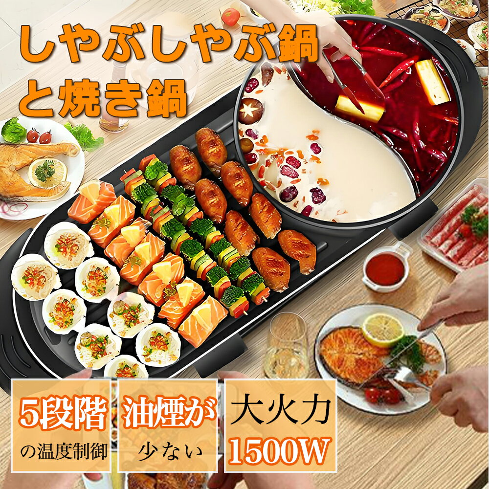 ホットプレート 大型 家庭用 業務用 鉄板焼き2in1 仕切り鍋 火鍋 二食鍋 おしゃれ しゃぶしゃぶ鍋と焼き鍋 焼肉プレート コンパクト 無煙 焼肉グリル 鍋 薄型 3~6人 キッチン両用器 卓上鍋 BBQ 89%油はね削減 5段階智能温度制御