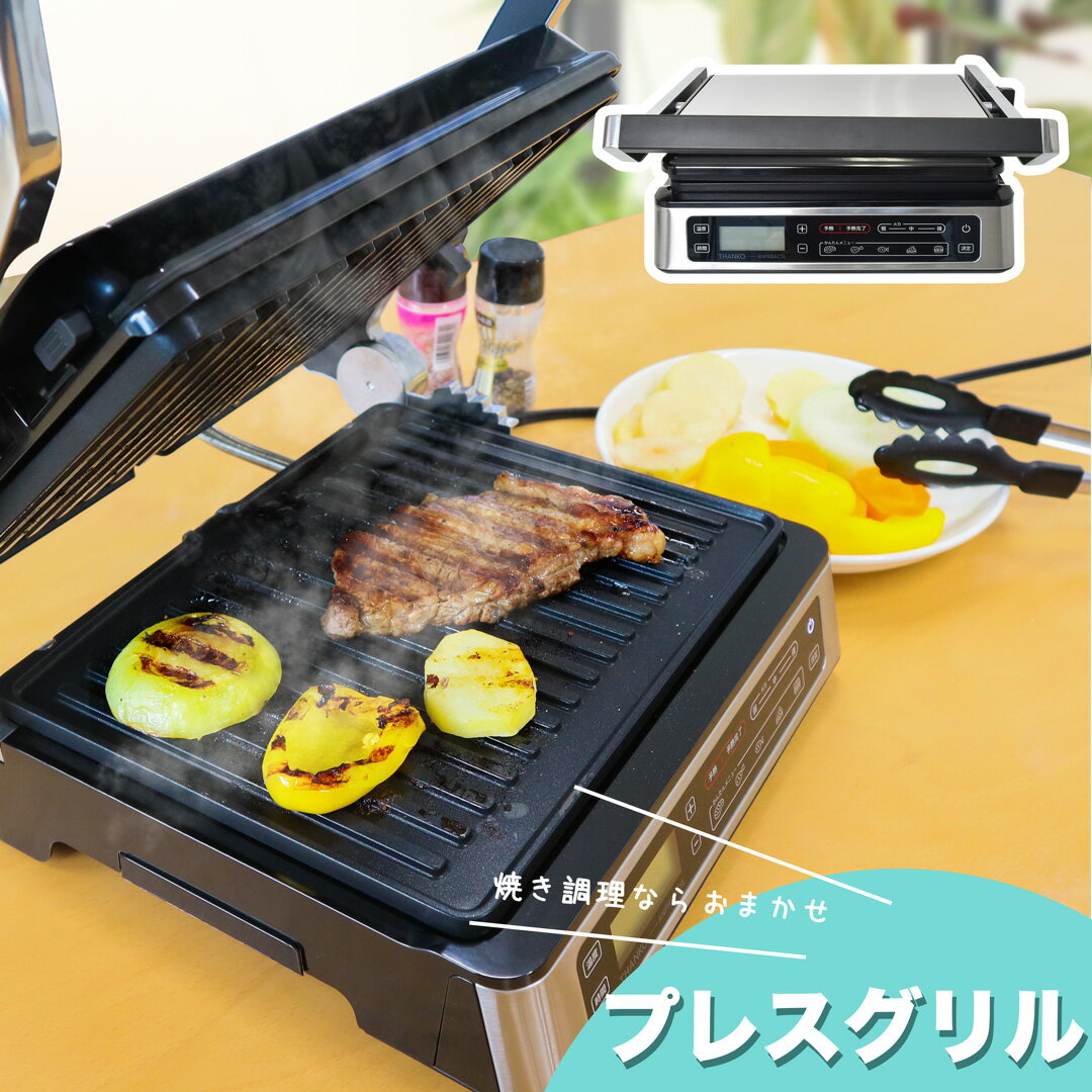 サイズ 本体:幅360×高さ340×奥行140(mm)プレート:幅290×高さ230×奥行10(mm) 重量 約4.1kg(本体・プレート含む) 電源 AC100V 50/60Hz 定格消費電力 1000W ヒーター温度範囲 120~230℃ タイマー設定 5~60分 かんたんメニュー 5種類 油トレイ 200ml ケーブル長 150cm 安全装置 サーモスタット、温度ヒューズ 素材 本体:ステンレス プレート:アルミニウム合金 付属品 本体、プレート、油トレイ、日本語説明書 注意事項 ※記載されている物以外は付属いたしません。 ※落としたり強い衝撃を与えないでください。 ※分解しないでください。 ※本製品をご利用において生じる物品の破損は、保証の対象外となります。 ※異常を感じたらただちにご使用をやめ、弊社カスタマーサポートまでご連絡ください。 ※ご使用中においてのお客様の過失による故障、破損、改造等はサポート保証の対象外となります。 ※正しく使用されない場合に生じた事故等について弊社での責任は負いかねます。 ※製品仕様は改善のため予告なく変更する場合があり、そのため説明書記載の内容と異なる場合があります。 パッケージサイズ 幅400×高さ380×奥行190(mm) パッケージ込み重量 約4.5kg 保証期間 購入日より12カ月 発売日 2022/12/2 ※仕様は改善のため予告無く変更する場合があります。お肉がパリッと短時間で美味しく焼ける、こだわりのコンタクトグリル 上下を挟んでプレスして焼く、だから短時間で肉が美味しく焼きあがります。 特に厚みのある肉、しっかり皮目を焼きたい鶏肉におすすめ。 挟んで焼くことにより、焼きむらができずに均一に火が通ります。 BBQの時のような焼き上がりで旨味アップ。 ホットプレートとしても使えて、立てて収納可能なプレートグリルです。 挟んで時短で美味しく焼く 厚みのある肉をフライパンでしっかり焼こうとすると、かなり時間がかかります。 もっとスピーディに!しかも美味しく焼くならば、挟んで焼くのがおすすめです! プレスグリルは上下の鉄板で肉を挟み込んで、上下で熱をかけて焼くので、あっという間に焼きあがります。 しかも挟んで押さえているので、肉の厚みが均一になり焼きむらができにくくなります。 プレスすることで肉からでる油は、本体の油トレイに溜まって周りが汚れにくくしかもヘルシーです。 上下の高さ5段階調整、ホットプレートとしても使えます 上下のプレートのすき間は5段階で調整可能です。 完全にプレスせずに挟んで焼くことができます。 また上下のプレートを完全にフラットにすれば、ホットプレートとして使用することができます。 卓上で肉や野菜を焼いて食べることができます。 温度・タイマー設定可能、かんたんメニューもあり 上下のプレートは別々に温度を設定することができるので、こだわりの焼き加減で焼くことができます。 ホットプレートとして使う時でも左右で違う温度で焼くことができます。 細かく温度設定するのは面倒、といった場合はあらかじめセットされたメニューがあるので安心です。 お手入れ簡単で収納しやすい プレートと油トレイを外して洗えるのでお手入れ簡単。 また本体を立てて収納できるので、場所をとりません。 肉を焼く以外にも使えます 肉料理や野菜以外にも、魚やホットサンド、パニーニやハンバーガー、焼きおにぎりなど。 焼く調理ならおまかせです! 卓上で熱々を食べられます。 サイズ詳細 ☝ページトップ