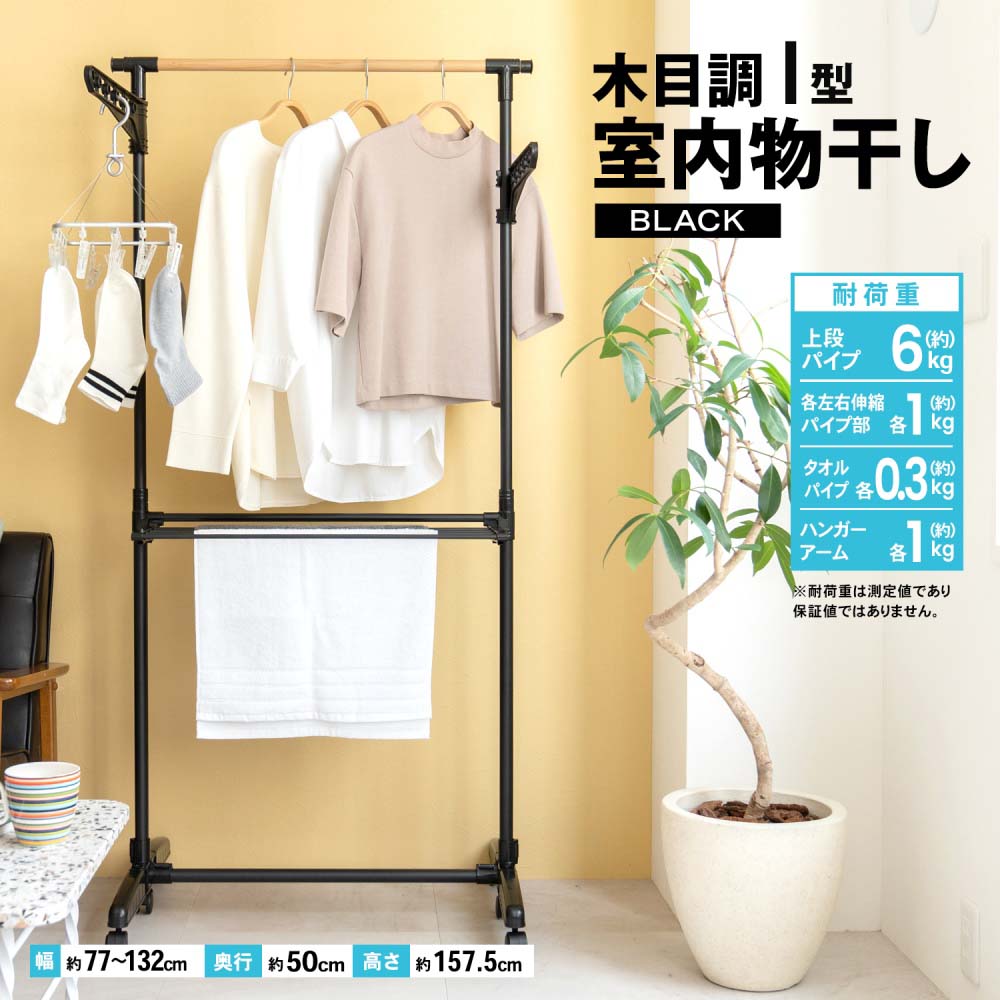コーナンオリジナル LIFELEX 木目I型室内物干BK WH21-3173/キャスター タオルハンガー 木目調 延長ポール 軽量 コンパクト 隙間収納 ライフレックス 部屋干し 室内干し 梅雨湿気対策 コーナン