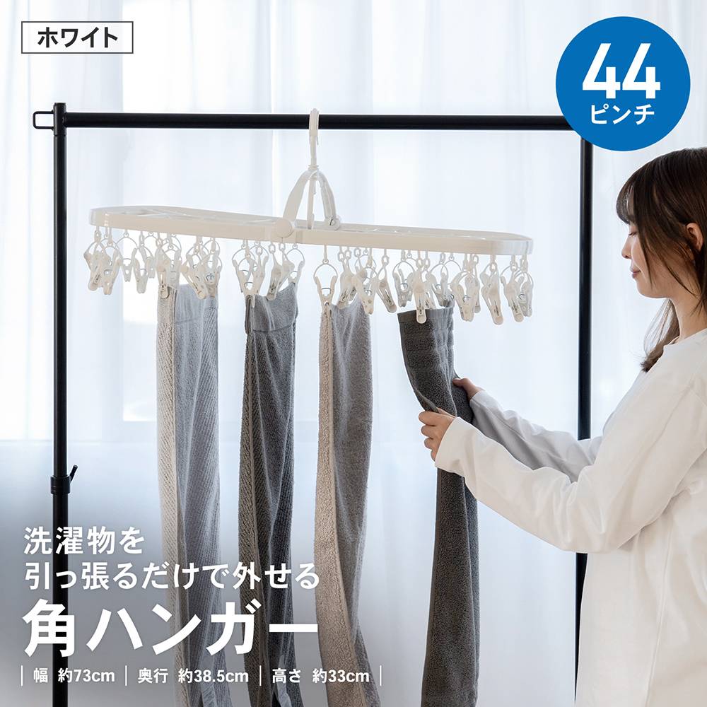 【特長】●引っ張るだけで、洗濯物が外せる 洗濯物の取り込み時間を短縮●引っ張るだけ!! 真下に引っぱるとピンチが少し開き、洗濯物が落ちる仕組みです。 洗濯物を取り込む際にピンチをつまむ手間が省けるため、時短になります。●大きめ波型&角丸ピンチ 大きめの波型で先端が丸いため生地を傷めにくく洗濯物をしっかり挟めます。●掛けやすいダイレクトフック 物干し竿にそのまま掛けられる便利なダイレクトフック。●毎日のお洗濯に便利たくさん干せる、44ピンチ たくさん干して、時間もスペースも節約! 44ピンチの角ハンガーで、洗濯の効率をぐっと高め、快適な毎日を。【仕様】●サイズ:約幅73×奥行38.5×高さ33cm●材質:本体/ポリプロピレン フック/ポリプロピレン ピンチ/ポリプロピレン?銅線 ピンチ紐/ポリエチレン●44ピンチ【注意事項】※ご使用前に必ず付属の取扱説明書を熟読の上、ご使用ください。※本来の用途以外には使用しないでください。※ご使用前に製品各部を点検してください。また、異常が認められる場合は使用しないでください。※強風時には屋外で使用しないでください。※洗濯物はバランスよく干し、洗濯物が落下しないようにご注意ください。※破損防止の為、フックに無理な力がかかる掛け方はしないでください。※炎天下でのご使用は、本体が熱を持つ場合がありますので、取り扱いには十分ご注意ください。※長時間屋外に放置されると紫外線により退色劣化の原因になりますので、ご使用にならないときは屋内で保管してください。※火気や熱源、浴室乾燥機などのそばに置くと軟化して変形することがあります。※洗濯物をピンチの先端で引っ掛けることがありますので、ご注意ください。※洗濯物の材質や厚手の衣類などは、複数のピンチで干してください。※ジーンズや厚手の衣類などは、複数のピンチで干してください。※廃棄の際はお住まいの各自治体の処理方法に従ってください。※洗濯物を干さない状態ではフレームの両端が少し上がっていますが、洗濯物の重さに対応するためにあらかじめ設計されたものです。【注意事項】※火器や熱源、洗濯乾燥機などのそばに置くと、軟化して変形することがあります。