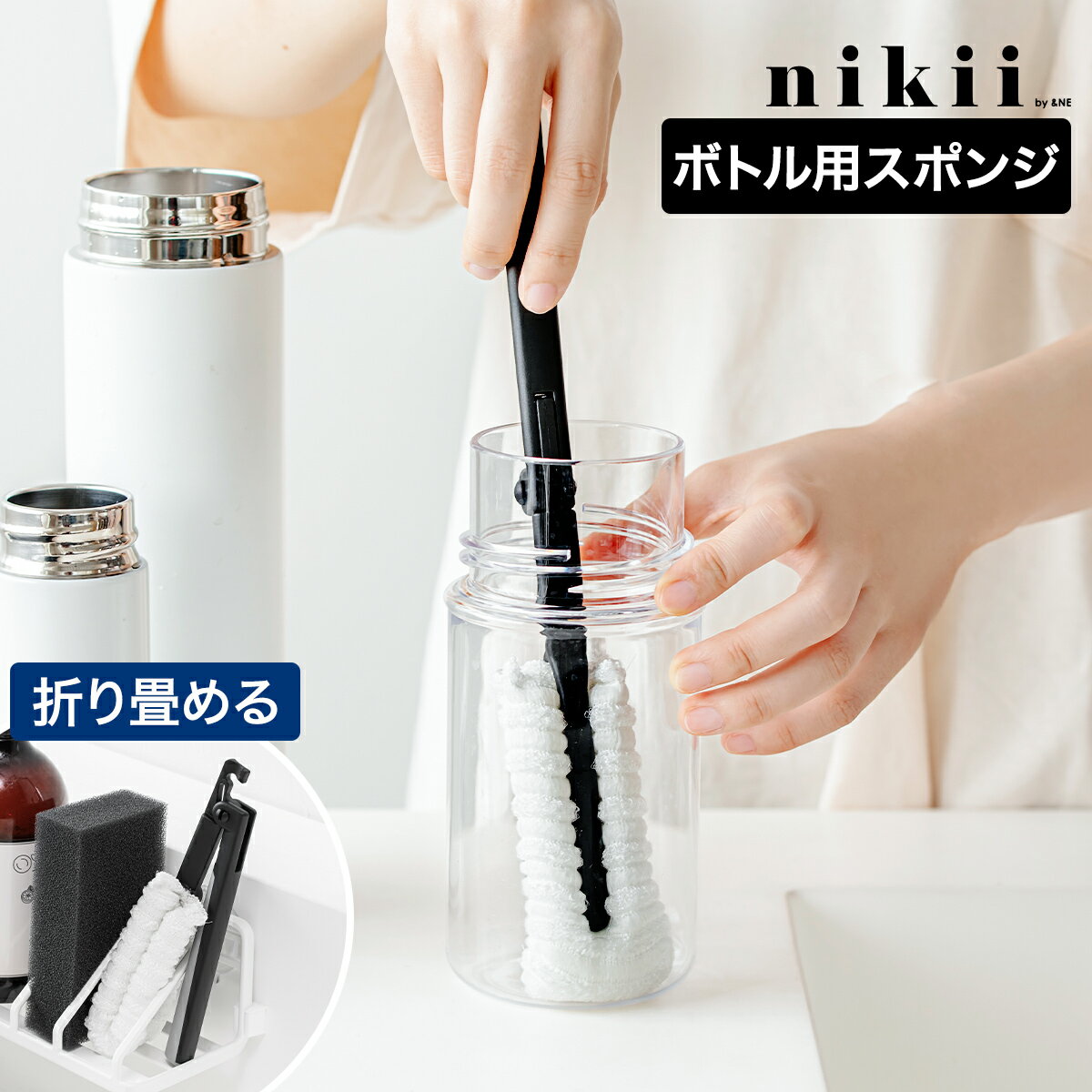 ボトルブラシ 柄付きスポンジ ハンドル付き ボトルクリーナー ボトル洗い スリム 折りたためる コンパクト コップブラシ 水筒 マグボトル タンブラー フック グリップ付き 新生活 モノトーン モダン &NE アンドエヌイー ニキ NMM-312[ nikii 折りたたみボトル洗い ]