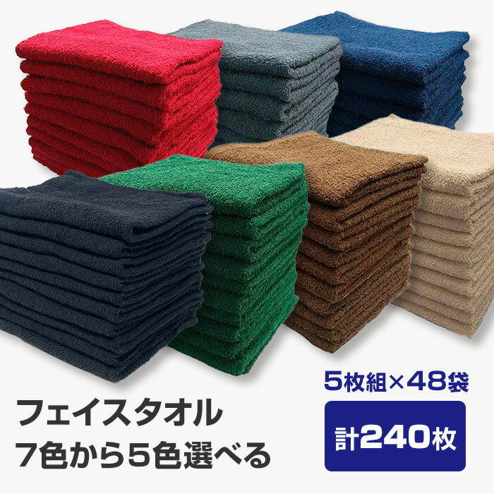 フェイスタオル 5枚組 7色から5色選べる 240枚セット(5枚組×48袋、1c/s) 総パイル 綿100% 業務用タオル アメニティタオル タオルまとめ買い カラータオル ワインレッド チャコールグレー ネイビー ダークグリーン ブラウン ベージュ ブラック