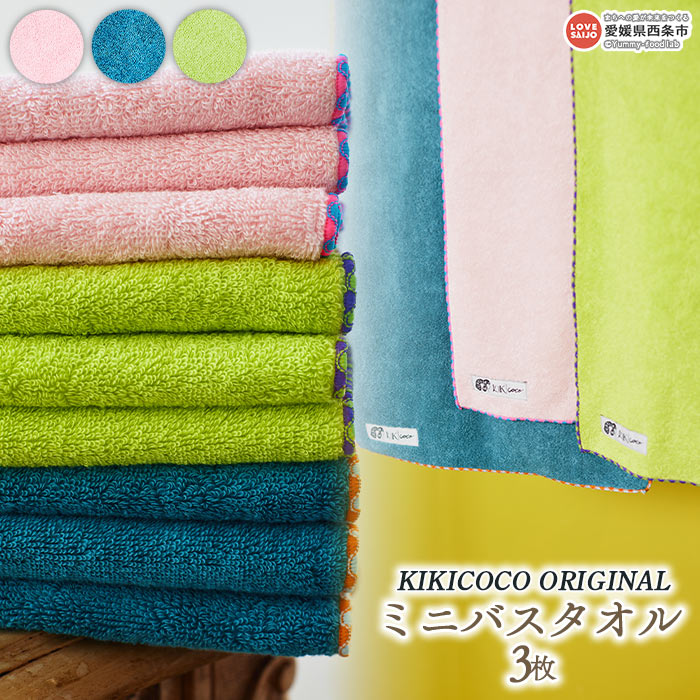【ふるさと納税】<KIKICOCO ORIGINAL ミニバスタオル3枚> ※翌月末迄に順次出荷します。 洗顔 洗面 お風呂 コットン 綿100% 吸水性 ふんわり なめらか 小さめ コンパクト スリム 日本製 大磯タオル 愛媛県 西条市 【常温】