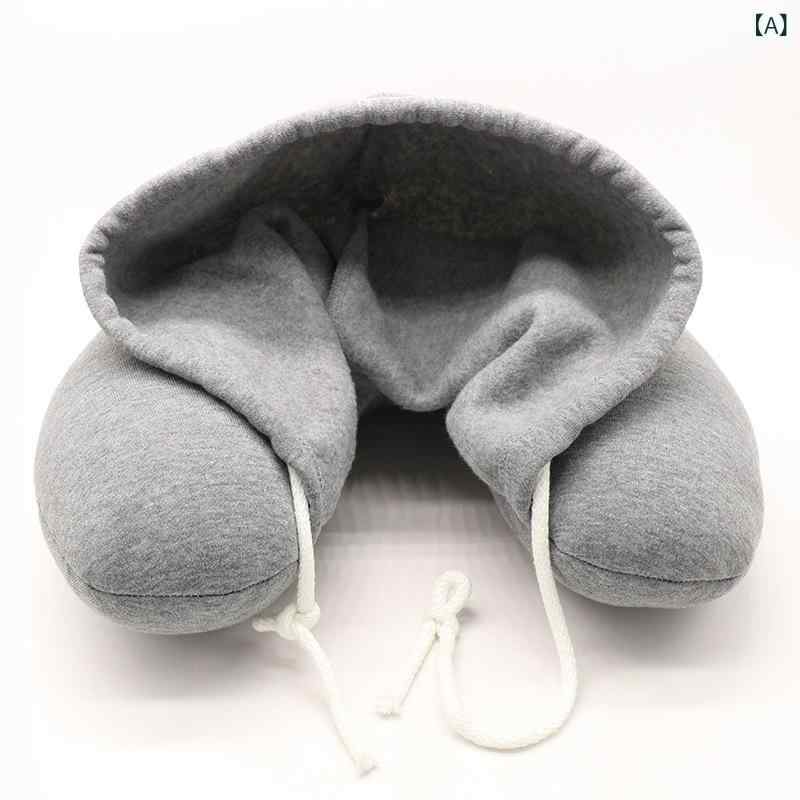 ネックピロー フード付き U字型 マイクロビーズ 大人用 オフィス 昼寝 車 飛行機 トラベル 移動 休憩 快適 グレー ブルー レッド ブラック 首クッション