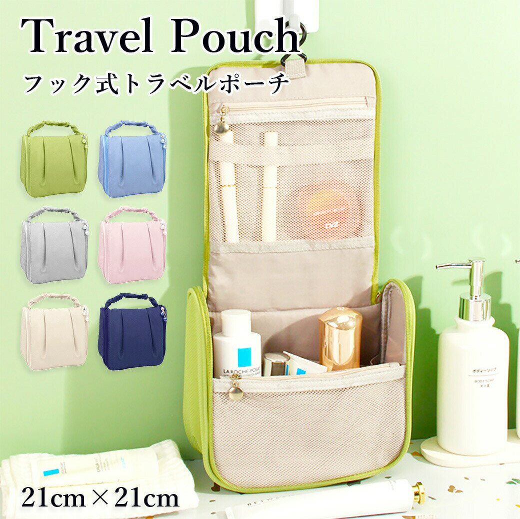 フック式トラベルポーチ(吊り下げOK)パール付き 大容量メイク・洗面ポーチ 旅先の洗面台がごちゃつく…そんな悩みをサッと解決してくれる、フック式のトラベルポーチです。壁やタオルバーに吊り下げれば、中身が一目で見えて取り出しもスムーズ。春色のやさしいカラーと、ファスナーのパールが上品で“大人かわいい”雰囲気にまとまります。 ■ 商品の特徴 フック付きで吊り下げ収納ができるので、洗面所やホテルでも省スペース&使いやすい 開けば中身が見渡せる設計で、コスメ・スキンケア・歯ブラシなどの小物が迷子になりにくい 大容量サイズ(21×21×奥行10cm)で、化粧水ボトルやメイク道具、ケア用品までひとまとめ メッシュポケット付きで、見せたい物と隠したい物を分けて収納しやすい 持ち手付きで持ち運びラクラク。旅行・出張はもちろん普段の整理ポーチとしても活躍 ファスナーのパールチャームがさりげなく高見え。シンプルだけど上品にまとまるデザイン ■ カラー ベージュ | グレー | ピンク | ピスタチオ | ブルー | ネイビー ■ 仕様 重量165g タイプフック式 トラベルポーチ / 吊り下げポーチ / メイクポーチ 素材ポリエステル サイズ縦21cm×横21cm×奥行10cm ■ おすすめシーン 旅行・宿泊先の洗面所で吊り下げて、コスメや洗面グッズをスマートに管理 出張のホテルでスキンケア一式をまとめて時短支度 温泉・サウナ・ジムのロッカー周りでの持ち運びポーチに 洗面台下や棚の整理用ポーチとして、普段使いの収納にも メイク道具+ヘアケア用品の“セット持ち”に 下着や小物の仕分けポーチとして、スーツケース内をすっきり 誕生日・引っ越し祝い・旅行好きさんへのちょっとしたギフトに ※長時間の浸け置き洗いはお避けください。※蛍光剤入り洗剤やアルカリ性の強い洗剤の使用はお控えください。※濃い色の物とは分けて洗ってください。※雨や汗など濡れた状態での摩擦により色落ちする場合があります。※モニターや光の環境により、実物と色味・素材感が多少異なる場合がございます。※サイズは採寸方法により多少の誤差が生じる場合がございます。おしゃれな春色のフック式トラベルポーチ フック式ポーチ トラベルポーチ 旅行用ポーチ 大容量 つり下げ式 シンプル 下着入れ メイクポーチ 春っぽい可愛らしいカラーのトラベルポーチが登場! フック付きで壁に引っかけたり吊り下げることができる 旅行用、出張で、普段使いに、メイク道具や 化粧水、下着や歯ブラシなどの用品が すっぽり入るつり下げ式のポーチです。 フックがついているので洗面所や壁に掛けて 使えばいちいち取り出さずに使えて便利です。 ファスナーにはパールがついていて上品で高見えします。 カラーは【ベージュ・グレー・ブルー・ネイビー・ピンク・ピスタチオ】 素材 ポリエステル サイズ展開 縦21cm×横21cm×奥行10cm カラー ベージュ・グレー・ブルー・ネイビー・ピンク・ピスタチオ 重量 165g お取り扱いのご注意 長時間の浸け置き洗いはお避けください。 蛍光剤の入る洗剤やアルカリ性の強い洗剤のご使用はお避けください。 濃い色の洗濯物と分けてお洗いください。 雨や汗など、濡れた状態での摩擦により色落ちする恐れがありますので、ご使用時にご注意ください。 商品写真はできる限り実物の色に近いようにしておりますが、パソコンの画質や光線環境により実際の商品と色味・素材感が多少異なる場合がございますので、予めご了承ください。 ★商品でお気づきの点がございましたらレビュー記載前に当店までお問い合わせください。