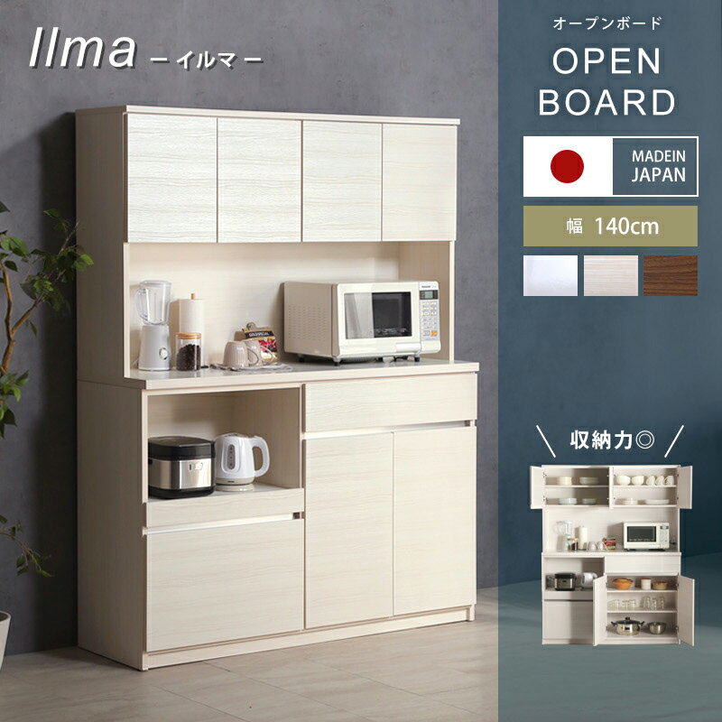 5%offクーポン 23日まで■食器棚 国産 幅140cm 140cm 日本製 キッチンボード レンジ台 キッチンラック キッチン収納 カップボード ダイニングボード 大川家具 コンセント コンセント付き ハイタイプ ホワイト イルマ オープンボード140