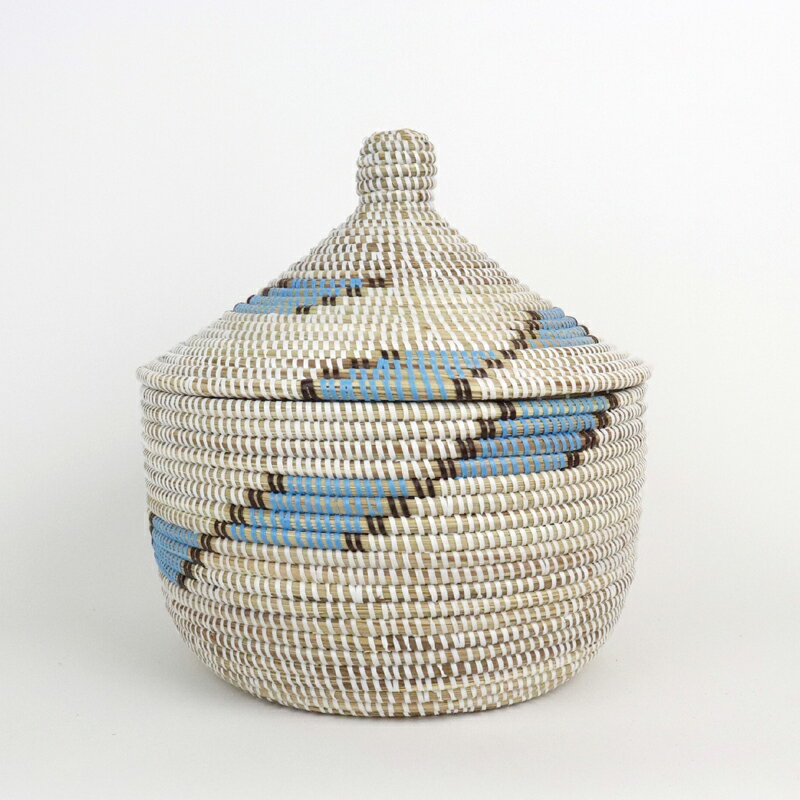 セネガルかご ぷっくり 蓋付き 段々柄 白水色