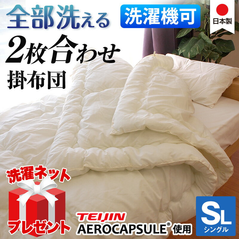 【洗濯ネットプレゼント】テイジン使用 2枚合わせ 掛け布団 シングルロング 150×210cm 掛布団 肌掛け布団 二枚合わせ テイジン エアロカプセル使用 洗える布団 洗える キナリ オールシーズン 夏用 冬用 肌布団 来客用 コンパクト