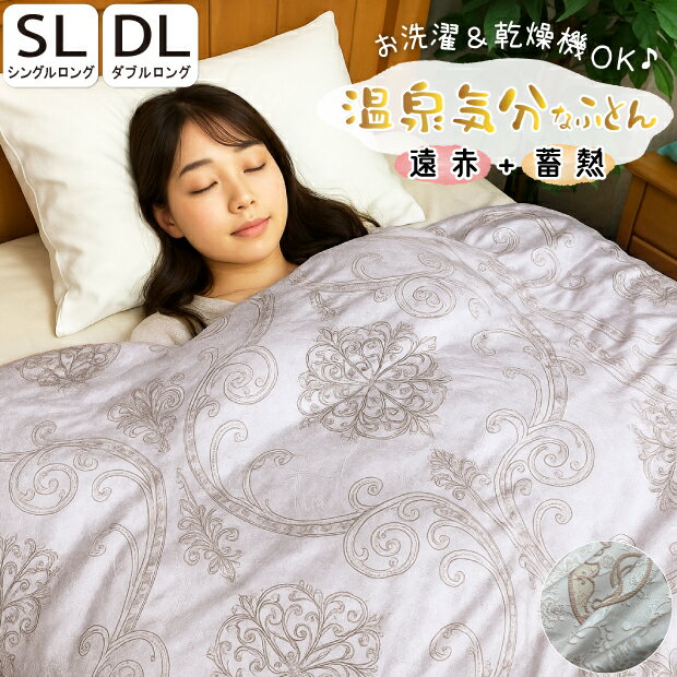 抗菌防臭!光触媒加工無料実施中 実店舗にて行っている抗菌防臭加工(2500円分)を 今なら無料サービス!ご希望のお客様は”希望する”に チェックをお願いします。 詳細はこちら 温泉気分®なふとん 掛け布団 シングルロング ダブルロング サイズ ・シングルロング(150×210cm) ・ダブルロング(190×210cm) ふとん側 ポリエステル100% マスの数 ・シングルロング(横5×縦6マス) ・ダブルロング(横6×縦6マス) 詰め物 ポリエステル100%(エアロカーボン) 詰め物重量 シングルロング:約1.5kg ダブルロング:約1.9kg その他 カバー取付用8か所ループ付き(掛けカバー別売り) 収納ケース入り(縦横三つ折りに収納されています) 中国製 ※入荷時期によりパッケージデザイン等が変更になる場合がございます。 ※ 「グレー」はシングルロングサイズのみとなります。 お手入れ 使用時の注意事項 ご使用される際は、布団記事の汚れや保護のため、 シーツまたはカバーをかけてご使用されることをお勧めします。 洗濯時のご注意 必ず洗濯ネットをご使用いただき30℃以下の水温で弱水流で洗ってください。 (洗濯機の種類、サイズによっては洗えない場合もございます。) 繰り返し洗濯すると、洗濯後に布団の中綿が偏ることがあります。 その場合は、干す際に中綿の偏りをほぐすように形を整えてから 日陰で干してください。 もしくはご家庭や業務用のタンブル乾燥機をご使用いただけます。 (排気温度上限60℃) 干し方のご注意 カビやダニを避けるため使わない間でも時々布団は日干し、または陰干ししてください。 ふとん叩きで強く叩くことはおやめください。強く叩くと記事や中綿を傷めることになります。 収納のご注意 なるべく湿気の少ないところに収納してください。 湿気が多いと、カビやダニ発生の原因になることがあります。 遠赤効果で暖かさ持続! 「羽毛のような快適な暖かさを、羽毛ではない素材で どう提供できるか」という点に着目して開発された中綿 分子レベルの着想による新しい中綿「エアロカーボン」使用。 炭素繊維を配合で暖かさUP! 一般的なポリエステル綿に比べその差なんと6.9℃! 遠赤外線効果により暖かさ持続 消臭機能もプラス シリカは蓄熱作用との相性が良く輻射された熱エネルギーを効率よく 吸収し繊維自体の温度を上昇させて蓄熱保温効果を発揮します。 ご家庭(またはコインランドリー)で洗える&乾燥可能 本品は洗濯も乾燥もOKという扱いやすい商品です。 (取扱い表示・洗濯表示に必ず従ってください。) > ヌード掛け布団(カバーは別売り)です。 冬用の掛けふとんです(夏用ではありません) 電気毛布などのように自ら発熱する商品ではありません。 ※ 画像はイメージです。 モニターにより実物と多少異なって見える場合がございます。リカバリーウェアなどでも近年 再注目されている遠赤外線 入荷時期によりパッケージデザイン等が変更になる場合がございます。
